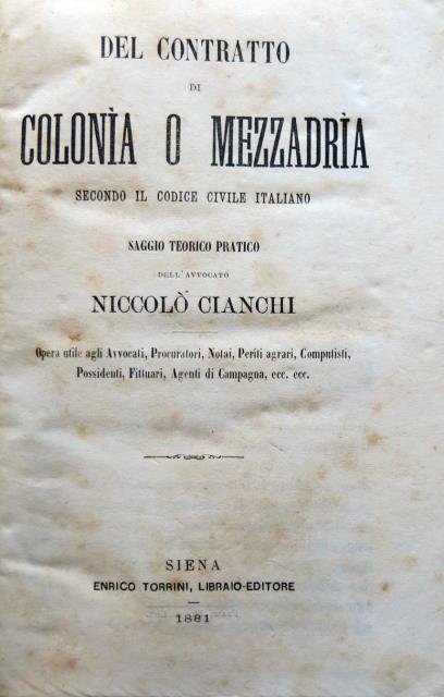 Del contratto di colonia o mezzadria. Secondo il Codice Civile italiano. Saggio Teorico pratico dell'Avvocato Niccolò Cianchi. Opera utile agli Avvocati, Procuratori Notai, Periti agrari, Computisti, Possidenti fittuari, Agenti di Campagna, ecc. ecc.