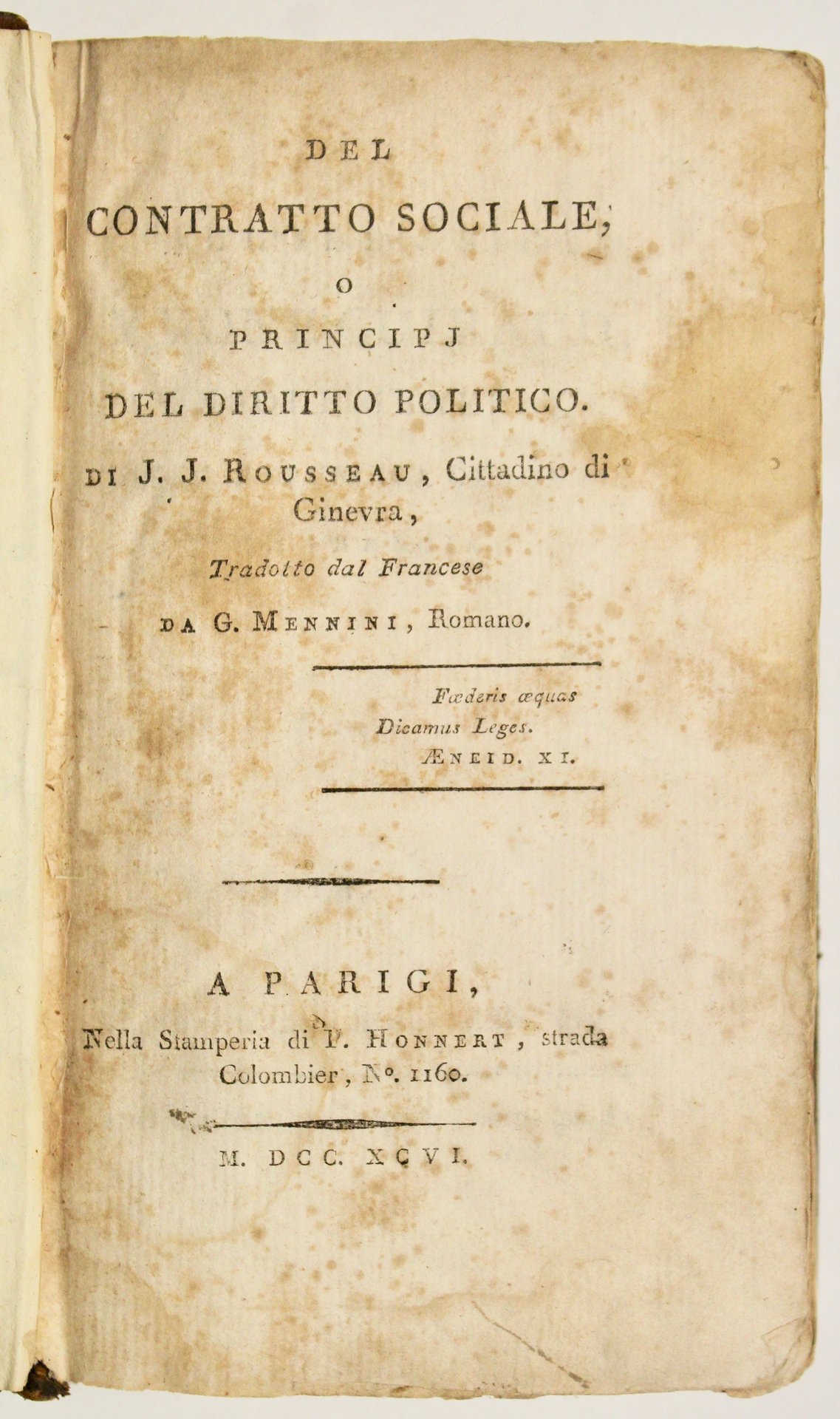 Del contratto sociale o principj del diritto politico.tradotto dal francese da G. Mennini. Parigi, Honnert, 1796. (Insieme a:) Supplément au contrat social applicable particulièrement aux grand nations. (Parigi, S.d.)
