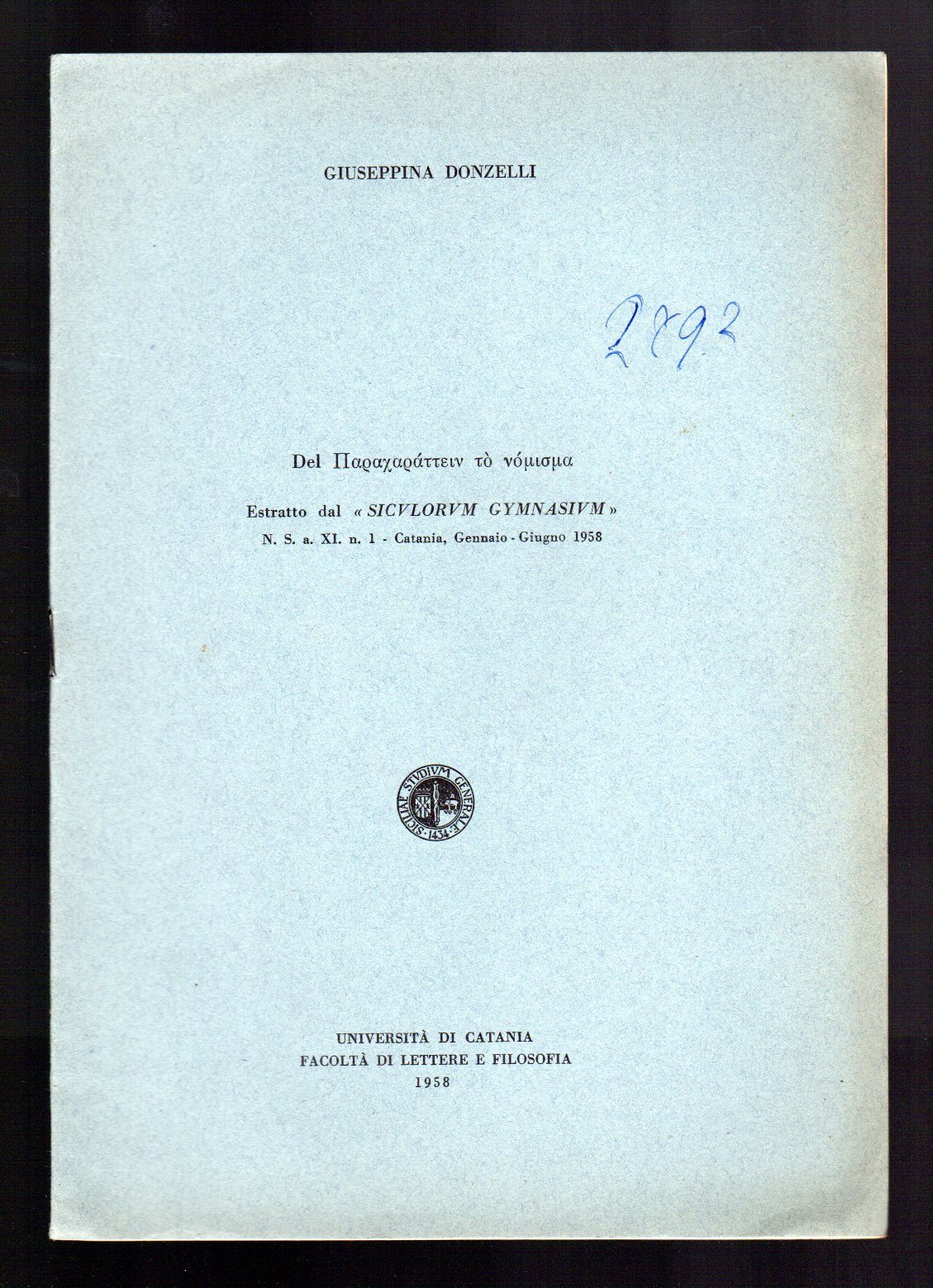 Opuscolo vintage. Estratto dal "Siculorum Gymnasium" - N. S. a. XI - N. 1 - gennaio-giugno 1958. Ordinario segno del tempo.