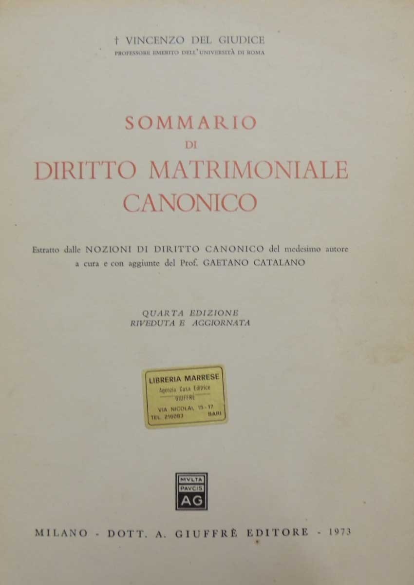 Vincenzo Del Giudice, Sommario di diritto matrimoniale canonico. Estratto dalle Nozioni di Diritto canonico del medesimo autore e con aggiunte del Prof. Gaetano Catalano, Dott. A. Giuffrè Editore, Milano 1973, quarta ed. riveduta e aggiornata, pp. IV, 144, cm 25, br. ed. Etichetta adesiva di rivenditore alla prima di copertina. Leggere tracce d’uso, con minime abrasioni e qualche piccolissima mancanza alla brossura, una piccola annotazione a biro alla prima carta bianca, lieve brunitura della carta, per il resto buona copia.