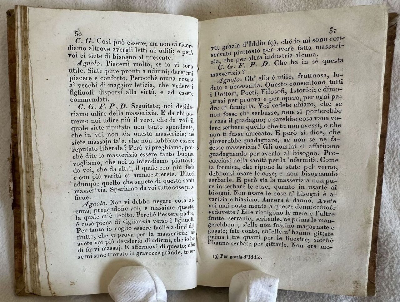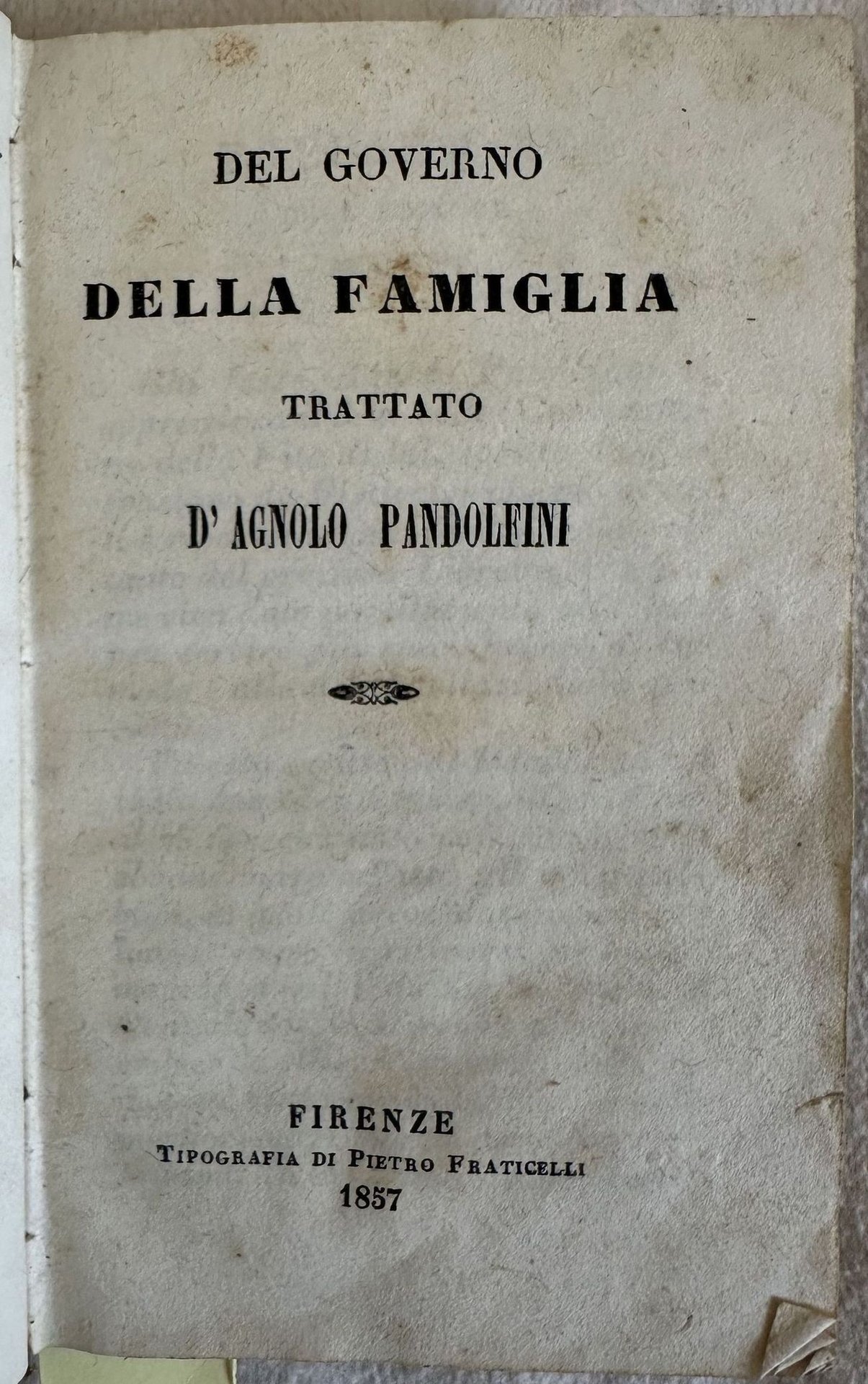 Edizione del 1857 di questa opera attribuita al politico fiorentino Agnolo Pandolfini (1360-1446). Lo scritto è in realtà parte del terzo libro della Famiglia di Leon Battista Alberti e scritta circa quindici anni dopo la morte del Pandolfini. L'opera descrive il modo in cui debba essere correttamente gestita la famiglia. In buone condizioni. Copertina in mezza pelle coeva con decorazioni a secco in buone condizioni generali con usure e mancanze ai margini e dorso. Antica etichetta con nota manoscritta al piatto anteriore. Legatura in buone condizioni. Pagine in buone condizioni con fioriture. In 24. cm 13,5x9. Pp. 192.Edition of 1857 of this work attributed to the politician from Florence Agnolo Pandolfini (1360-1446). The writing is in reality part of the third book of the family of Leon Battista Alberti and written 15 years after the death of Pandolfini. The work describes the correct way the family should be managed. In good conditions. half leather coeval cover with embossed decorations in the spine in good general conditions with wearings and lackings in the extremities. Binding in good conditions. Pages are in good conditions with foxing. In 24. cm 13,5x9. Pp. 192.
