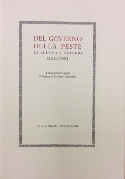 DEL GOVERNO DELLA PESTE. - A cura di Piero Cigada. Prefazione di Ermanno Paccagnini.