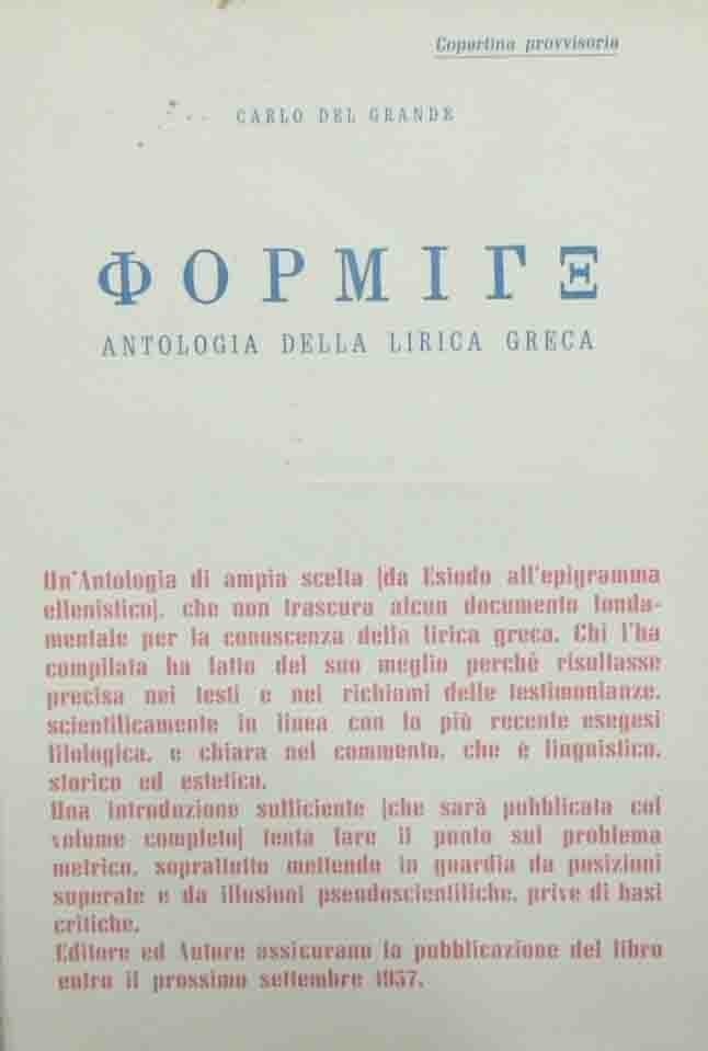 Carlo Del Grande, Phorminx. Antologia della lirica greca, Luigi Loffredo Editore, Napoli s.d. (ma entro il 1957), pp. 142, cm 23, br. ed. Testo in greco con introduzione e commento in lingua italiana. Saggio editoriale con copertina provvisoria e fascetta ed. di presentazione. Minime fioriture, lieve ingiallitura della carta, per il resto ben conservato.