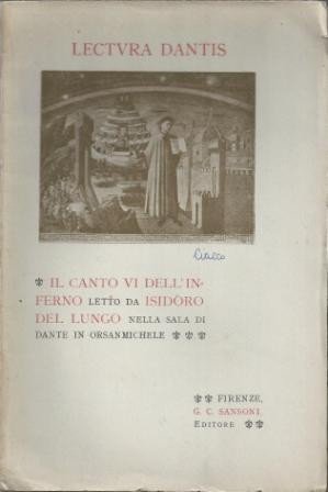 Il Canto VI dell’Inferno letto da Isidoro Del Lungo nella Sala di Dante in Orsanmichele, G. C. Sansoni Editore, Firenze 1925, pp. 42, ill. b.n., cm 24, br. ed. Collana Lectura Dantis. Testo della lettura effettuata nella Sala di Dante in Orsanmichele l’11 gennaio 1906. Tracce d’uso alla brossura, con leggere bruniture ai margini, un nome a biro alla prima di copertina, un piccolissimo restauro e una piccola mancanza al dorso, lieve ingiallitura della carta, ma nel complesso esemplare in buono stato di conservazione.