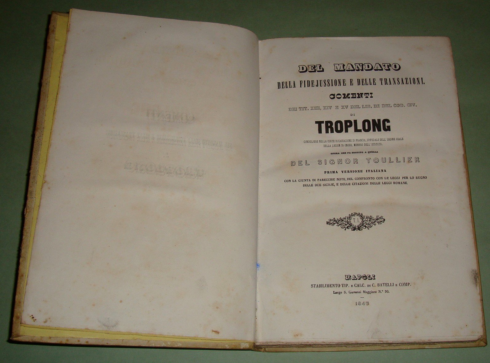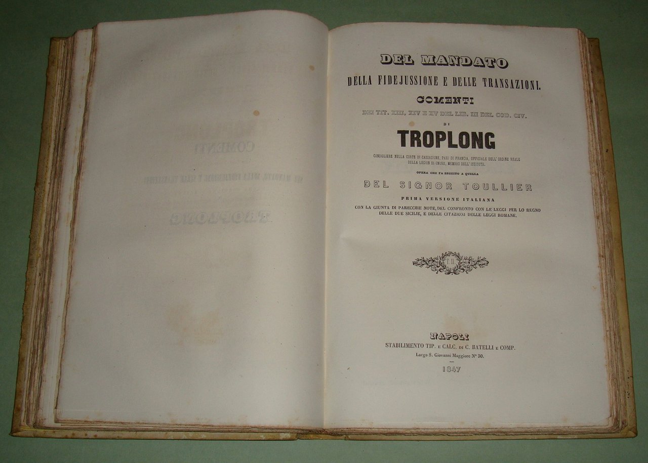 Del mandato della fidejussione e delle transazioni. Comenti dei tit. XII,XIV e XV del lib. III del Cod. Civ. di Troplong. Prima versione italiana.