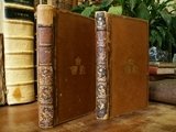 Due volumi in 8 legati in pelle, piatti inquadrati da filetti in oro, tre stemmi dorati impressi al centro dei piatti, dorsi a nervi decorati ai piccoli ferri (restauri), tagli dorati, sguardie marezzate (grande exlibris calcografico incollato), occhielli, frontespizi, XXVI, 347, 435 pp. Fra le pi note opere del Gioia in una corretta e bell'edizione, in bello stato, sporadiche fioriture al secondo volume. Importante e di scarsa reperibilit