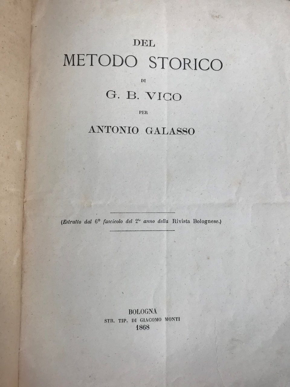 Fascicolo in 8, brossura originale muta, con dedica autografa dell'autore, frntespizio, 21 pp., biance finali. Originale ed approfondito saggio sul metodo della 'armonia storica' nella metafisica, introdotto dal grande pensatore. Pubblicazione estratta da 'Rivista Bolognese'. In ottimo stato ed impreziosita dalla dedica autografa dell'autore.