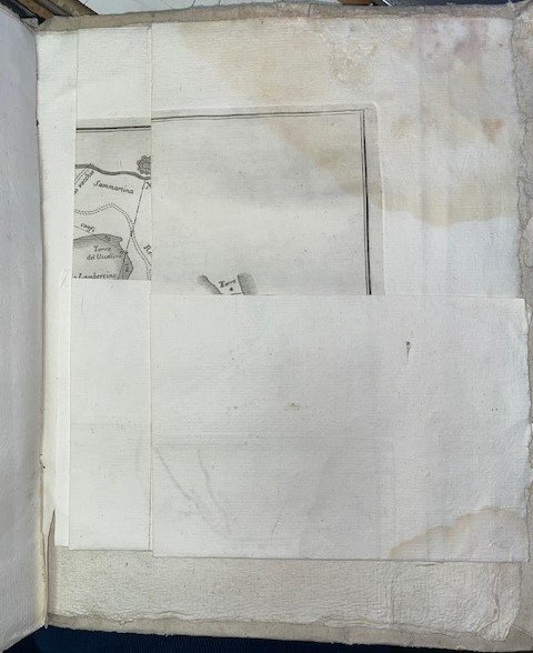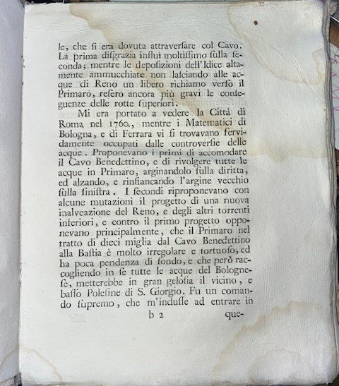 vol.unico -formato in 4- leg. in cartonato dell'epoca con titolo manoscritto al dorso-1 c.b con appunto manoscritto+7 carte +111 pagine ed una tavola f.t ripiegata " Andamento de Po di Primaro, e de' fiumi della pianura del Bolognese, e della Romagna"- presenti gore su tutte le pagine ai margini inf. e sup. - edizione dedicata a Giulio Mozzi patrizio Fiorentino- Milano 1768