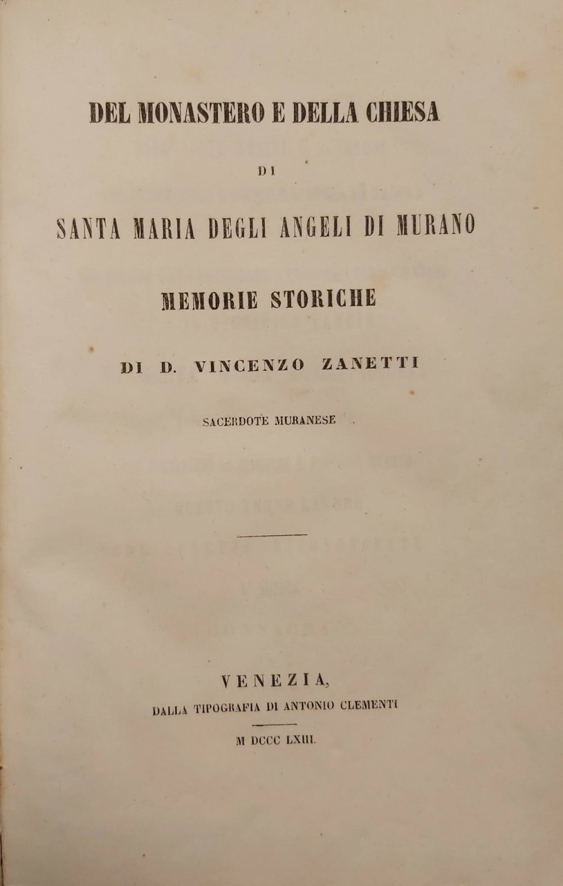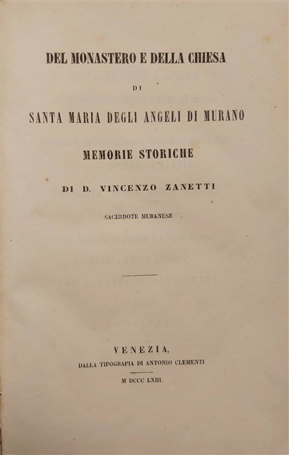 in-8 gr., pp. (4), IV, (2), 310, (2), leg. m. tela coeva con tit. oro al d., piatti in carta dec. Con 3 tavv. litogr. raff. opere d'arte della chiesa: il bassorilievo del cortile, la tavola del Pordenone, e il quadro con gli Angeli della cappella Maggiore. Dettagliata descrizione storica e artisitca della chiesa dell'isola veneziana di Murano, dalla fondazione fino alla metà dell'Ottocento, accompagnata da fonti e documenti. Lo Zanetti è autore di una nota Guida di Murano del 1866, questa sua pubblicazione sul monastero è rara. Ottimo esempl. [323]
