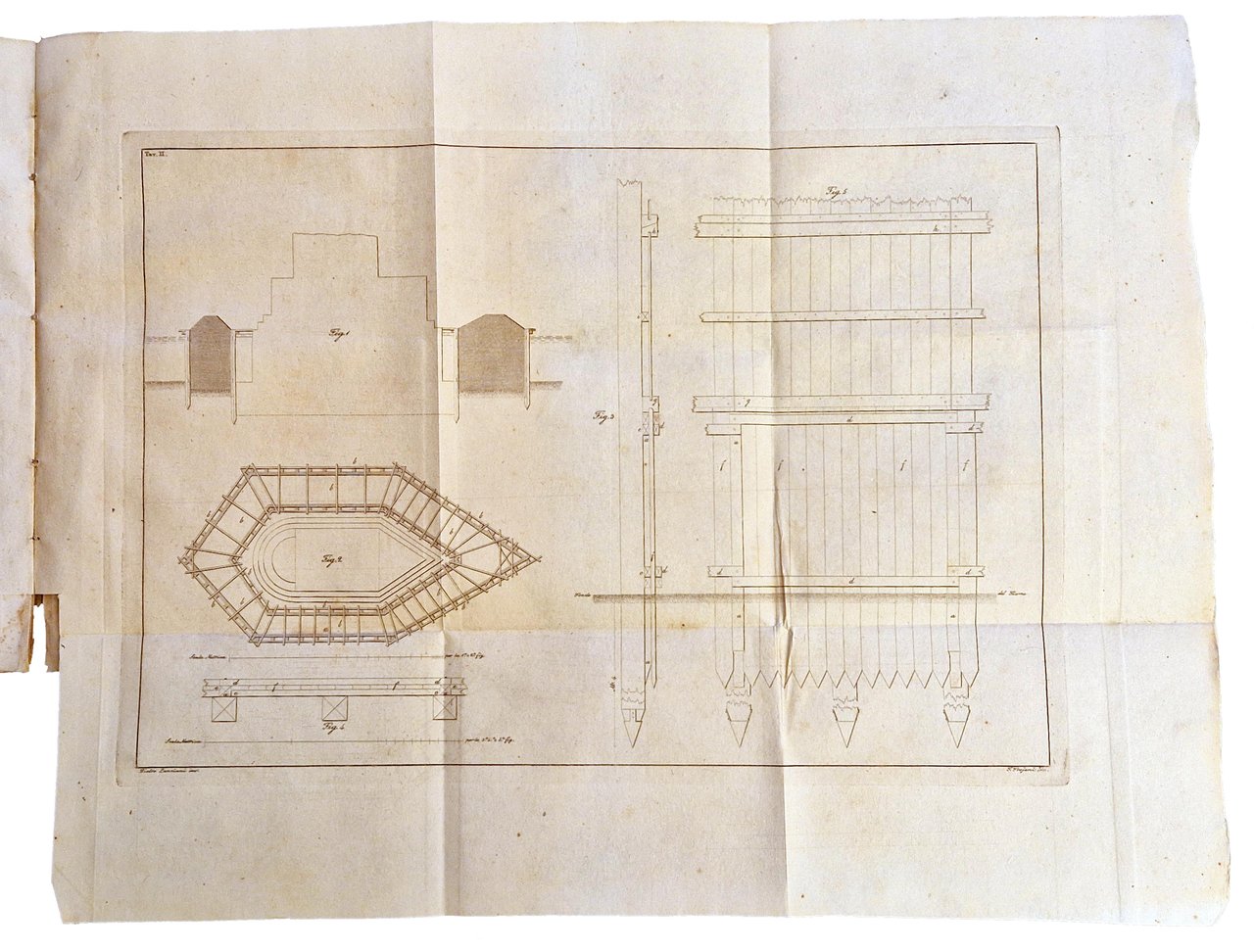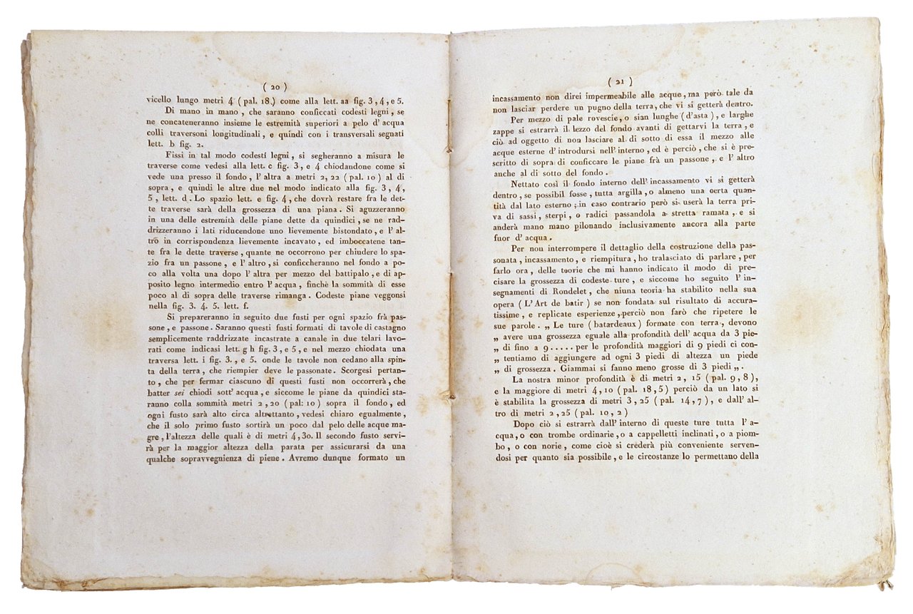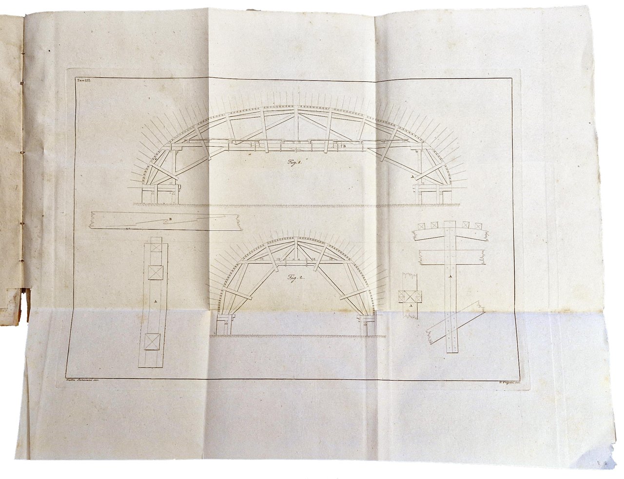 in-4° grande, 298x230 mm, leg. originale in cartonato muto leggero; pp. [4], 28, IIII c. di tav. ripiegate. Tavole calcografiche illustranti la pianta, il prospetto ed alcuni particolari costruttivi, più volte ripiegate, incise da F. Trojani su disegno di Pietro Lanciani. Interessante prima edizione di quest'opera di architettura del Lanciani. Rif.: IT\ICCU\SBLE\008109. OCLC, 1091939347. Cond.: Segni d'uso alla legatura (presenza di macchie, abrasioni, strappi e mancanze della carta al dorso). Testo molto marginoso, stampato su carta forte. Carte in barbe e parzialmente intonse. Presenza di un alone d'umido all'angolo superiore interno della maggior parte delle carte. Tavole ottime. Nel complesso, comunque, trattasi di un esemplare molto buono.