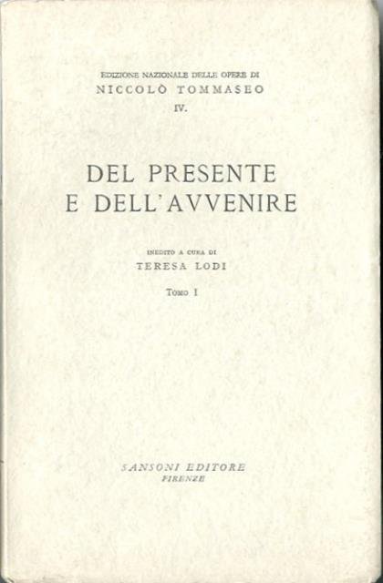 397 p. ; 24 x 15 cm. Edizione nazionale delle opere di Niccolo Tommaseo. Inedito a cura di Teresa Lodi. Brossura editoriale, coperta in cartoncino flessibile colorato (grigio chiaro). Esemplare intonso. Codice libreria 4330.