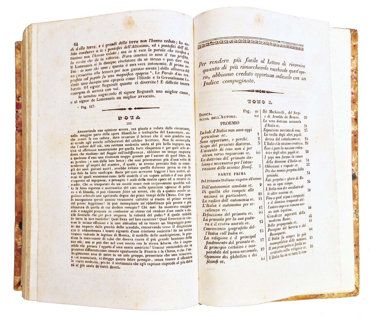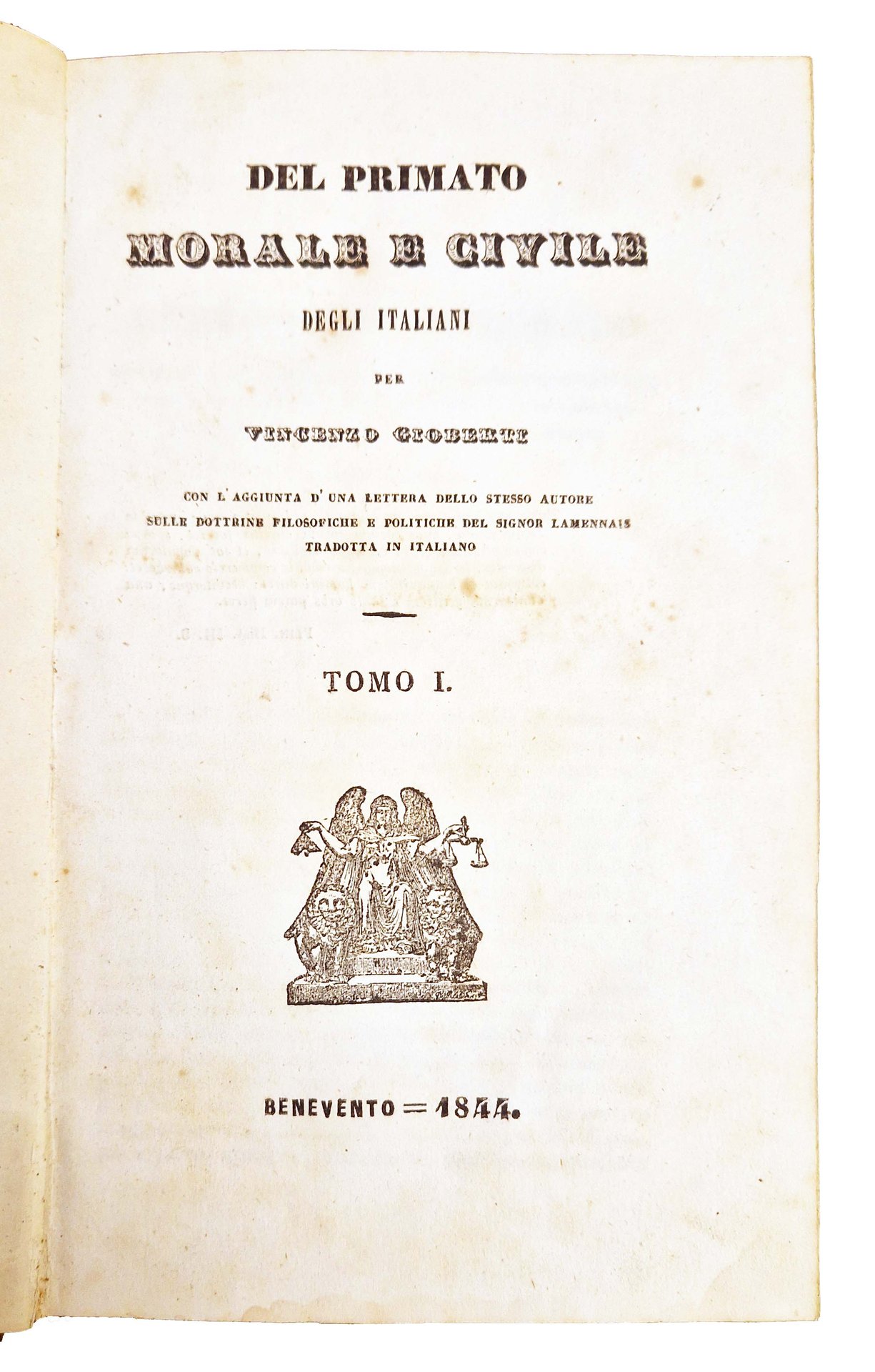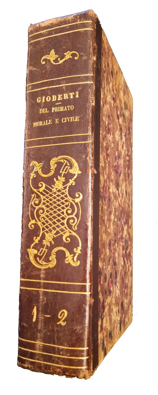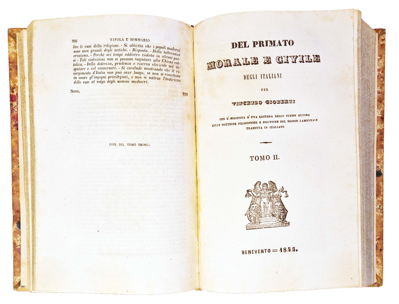 in- 4°, 220x140 mm, leg. coeva in mezza pelle marrone, con titolo, filetti e fregi dorati al dorso, carta marmorizzata ai piatti, tagli a puntini verdi; due tomi in un volume; pp. XXIV, 236; 333, [3 b.], 64, VII, [1 b.]. Poco comune edizione pubblicata a Benevento di questa famosa opera fiolosofica di Vincenzo Gioberti (1801-1852), presbitero, patriota e filosofo italiano, nonché il primo Presidente della Camera dei deputati del Regno di Sardegna, esponente di primo piano del Risorgimento italiano. Alla fine del testo del Tomo II il volume contiene la "Lettera sulle dottrine filosofiche e politiche del Sig. De Lamennais", sempre di Vincenzo Gioberti. Rif.: IT\ICCU\NAP\0424138. Cond.: Lievi tracce d'uso alla legatura (occasionali abrasioni sulla pelle alle cuffie ed alle cerniere). Carte interne pulite e croccanti. Esemplare in condizioni generali molto buone.