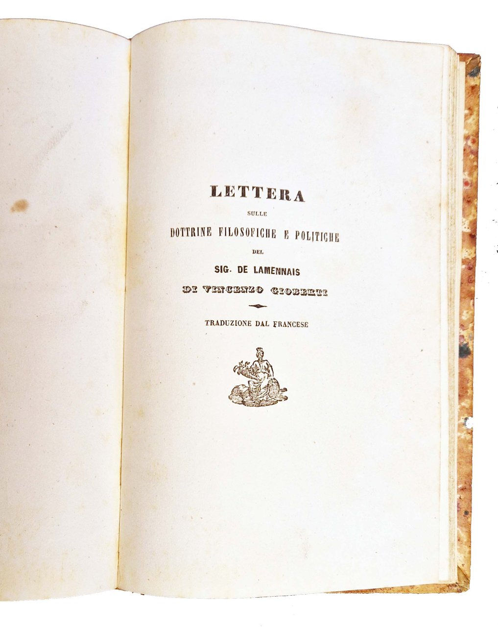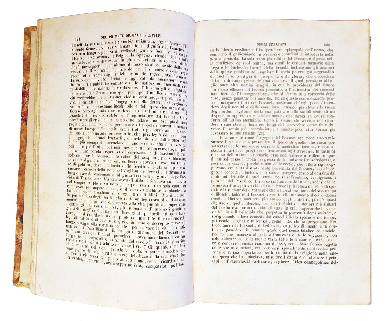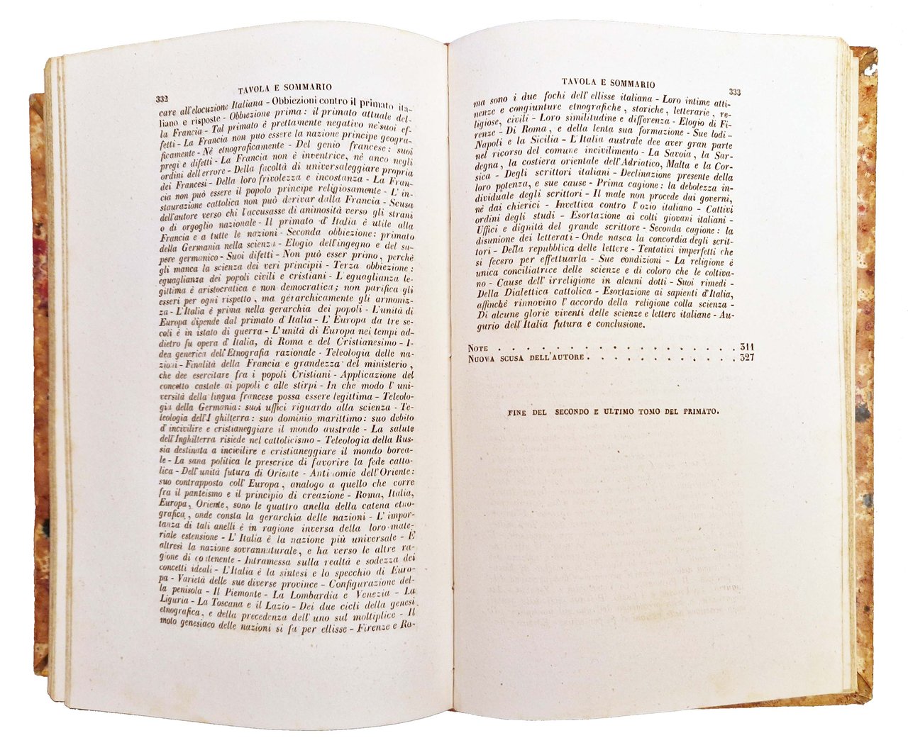 in- 4°, 220x140 mm, leg. coeva in mezza pelle marrone, con titolo, filetti e fregi dorati al dorso, carta marmorizzata ai piatti, tagli a puntini verdi; due tomi in un volume; pp. XXIV, 236; 333, [3 b.], 64, VII, [1 b.]. Poco comune edizione pubblicata a Benevento di questa famosa opera fiolosofica di Vincenzo Gioberti (1801-1852), presbitero, patriota e filosofo italiano, nonché il primo Presidente della Camera dei deputati del Regno di Sardegna, esponente di primo piano del Risorgimento italiano. Alla fine del testo del Tomo II il volume contiene la "Lettera sulle dottrine filosofiche e politiche del Sig. De Lamennais", sempre di Vincenzo Gioberti. Rif.: IT\ICCU\NAP\0424138. Cond.: Lievi tracce d'uso alla legatura (occasionali abrasioni sulla pelle alle cuffie ed alle cerniere). Carte interne pulite e croccanti. Esemplare in condizioni generali molto buone.
