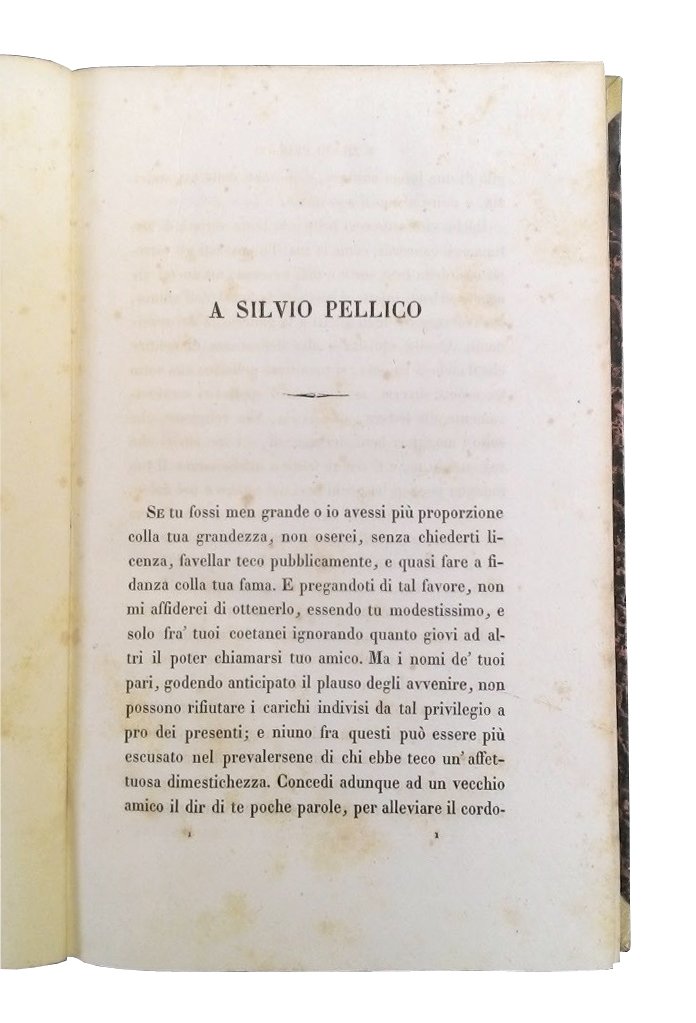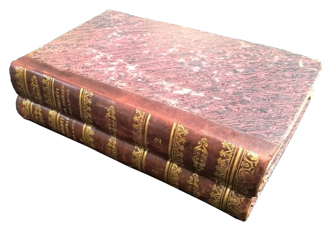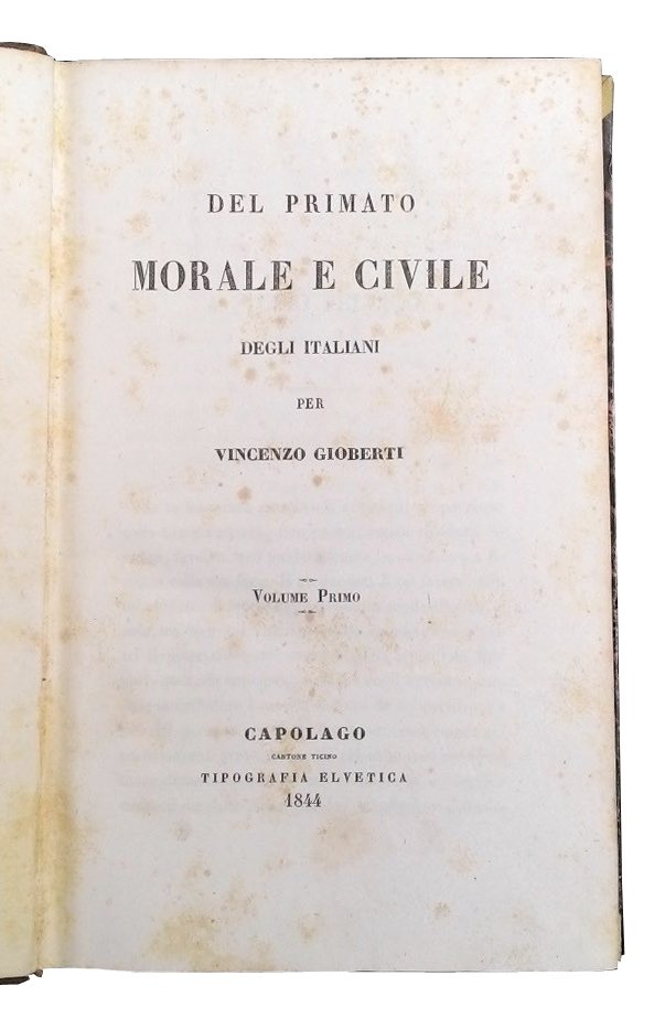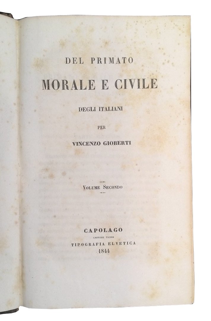 8vo (220x136 mm); leg. in mezza pelle marrone, con titolo, filetti, fregi e decori dorati al dorso liscio, piatti in carta marmorizzata con angoli in pergamena, tagli colorati a spruzzo; 2 vol.; pp. 505, 620; occhietto e front. a caratteri neri su entrambi i volumi. Seconda edizione di Capolago di quest'opera di filosofia-politica a cura del Gioberti, nella quale l'Autore sviluppa due tesi essenziali: l'autonomia e l'importanza della "nazione" Italia, e il suo primato, conquistato nei secoli, nel campo della scienza e dell'arte; inoltre, nel testo viene formulata l'ipotesi di una grande confederazione, guidata dal Papa, che suscitò alla sua uscita un'enorme impressione in tutto il paese, sfociata poi nei moti del 1848. Il testo è preceduto dalla dedica dell'Autore a Silvio Pellico, fatta a Bruxelles il 5 nov. 1812, e dalla scusa dell'Autore (per la "gravissima critica che darà luogo questo mio scritto"). Vincenzo Gioberti (1801-1852), sacerdote filosofo, saggista, politico. Prov.: indicazione d'appartenenza a La vecchia Parma - Antiquariato, su etichetta incollata alla controguardia ant. di entrambi i volumi. Rif.: IT\ICCU\IEI\0147701. Cond.: Tracce d'uso alla leg., con abrasioni alla pelle dei dorsi ed alle carte dei piatti, bruniture e fioriture; opera in buone condizioni generali. -- SECOND EDITION OF CAPOLAGO OF THIS WORK OF POLITICAL PHILOSOPHY BY GIOBERTI. Traces of use at the binding, with abrasions at spines leather and at boards papers; browning and foxing; copy in good condition.