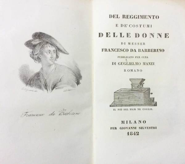 In-16 p. (mm. 167x106), brossura orig., pp. VIII,435, con un ritratto dell'A. in litografia. Volume 449 della Biblioteca scelta di opere italiane antiche e moderne. Contiene: Vita di Messer Barberino scritta da Federico Ubaldini - Del Reggimento.. - Annotazioni - Indice delle Voci, e modi di dire... Rare e lievi fioriture, altrimenti ben conservato, intonso.