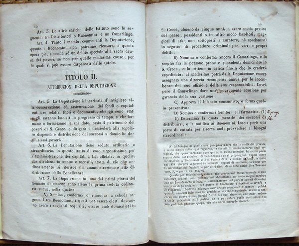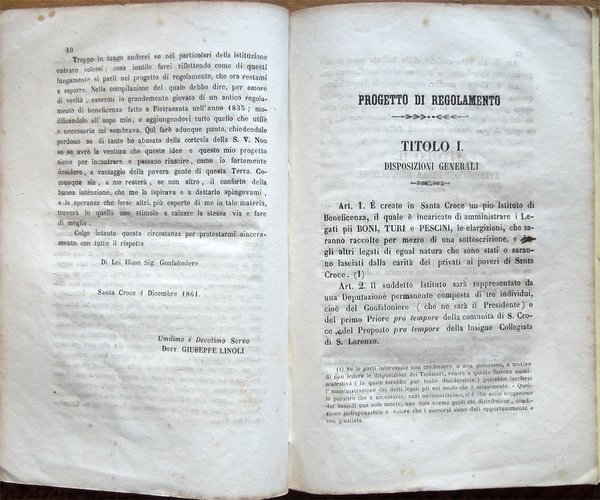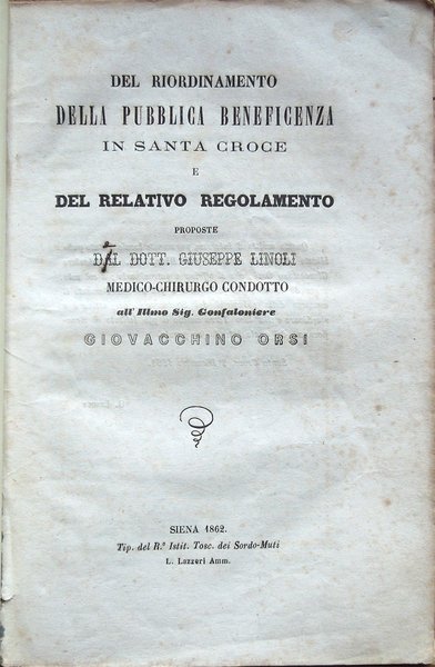 Del riordinamento della Pubblica Beneficenza in Santa Croce e del relativo regolamento proposte dal dottor Giuseppe Linoli, medico-chirurgo condotto, all'Ill.mo Sig. Gonfaloniere Giovacchino Orsi