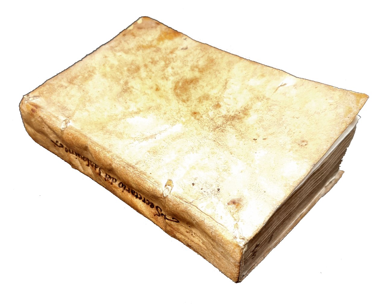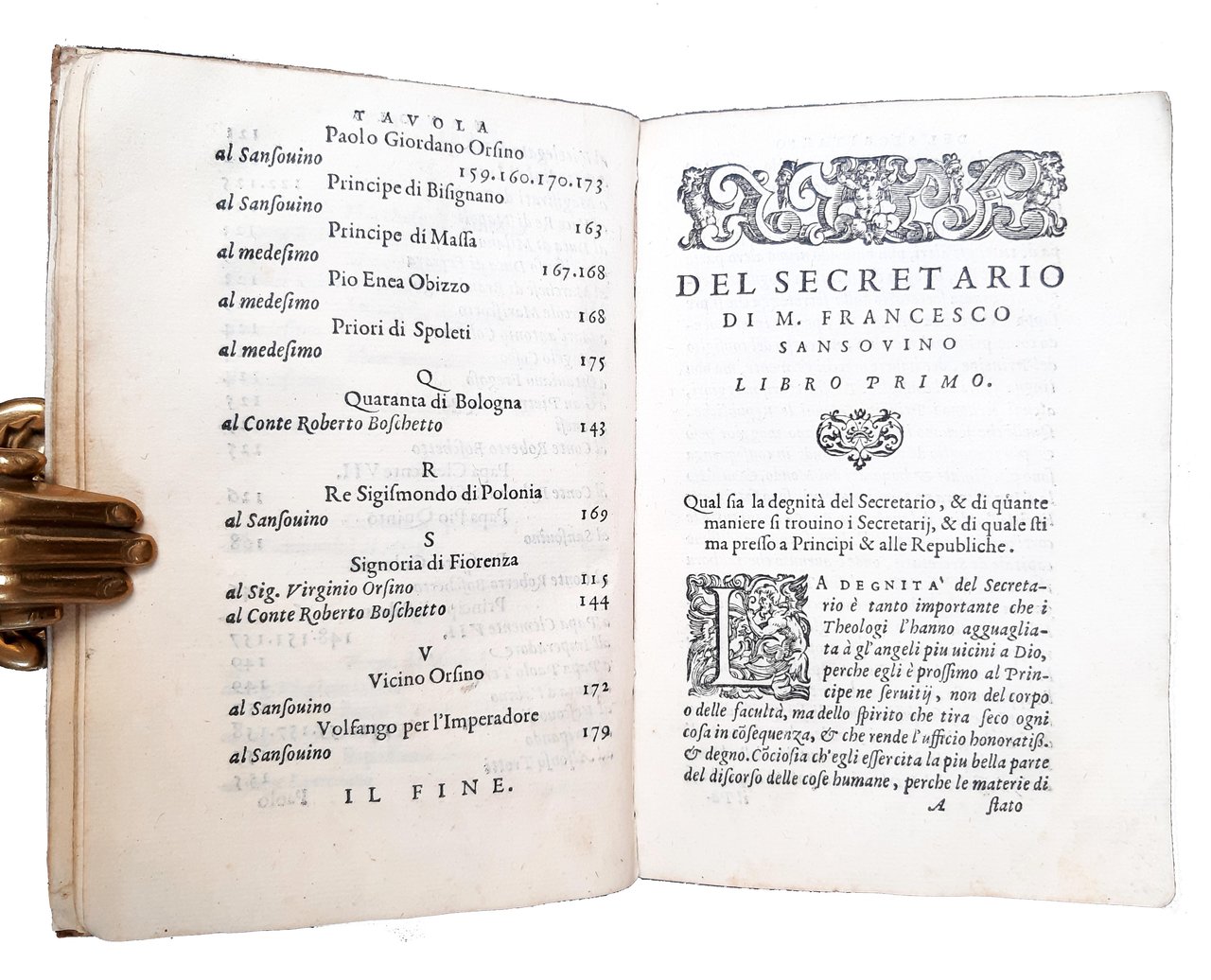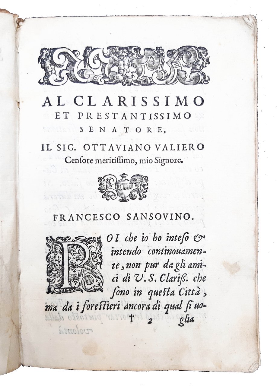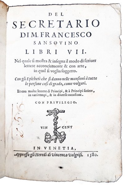 in-8°, 150x100 mm, leg. in pergamena morbida, con titolo manoscritto al dorso; carte [16], 222; testatine e iniziali xilografici; frontespizio a cartteri neri con marca tipografica (serpente attorcigliato a bastone a forma di tau sostenuto da mani uscenti da nuvole). Quinta edizione di questa ricca raccolta di lettere a cura del Sansovino, finalizzata ad insegnare l'arte di scrivere. L'opera è organizzata in sette libri; nei primi due, dedicati alla teoria, l'autore fornisce consigli tecnici in base al tipo, al carattere o allo scopo delle lettere che si vuole scrivere; i seguenti libri ci offrono molti esempi di lettere scritte da personaggi importanti del tempo in tutti i tipi di situazioni; il settimo libro è dedicato a poche lettere piuttosto lunghe di Francesco Sansovino stesso. L'ultima di queste lettere, datata Venezia 15 dicembre 1579, è particolarmente interessante: in essa l'autore fa la sua autobiografia e ci dà la lista di tutte le sue opere. Prov.: Indicazione d'apparteneza al frontespizio (iniziali manoscritte D.G.P.). Etichetta d'appartenenza incollata al contropiatto anteriore (ex libris Luciano Caruso). Luciano Caruso (1944-2002) è stato un poeta, artista e giornalista italiano. Rif.: IT\ICCU\TO0E\005615. CNCE 39142. OCLC, 909376697. Cond.: Segni d'uso alla legatura (pieghe, graffi, abrasioni). Bruniture e fioriture ad alcune carte; presenza occasionale di piccoli fori di tarlo a margine di alcune carte. Traccia di uno strappo al frontespizio, ben restaurato sul retro. Opera nel complesso in buone condizioni.