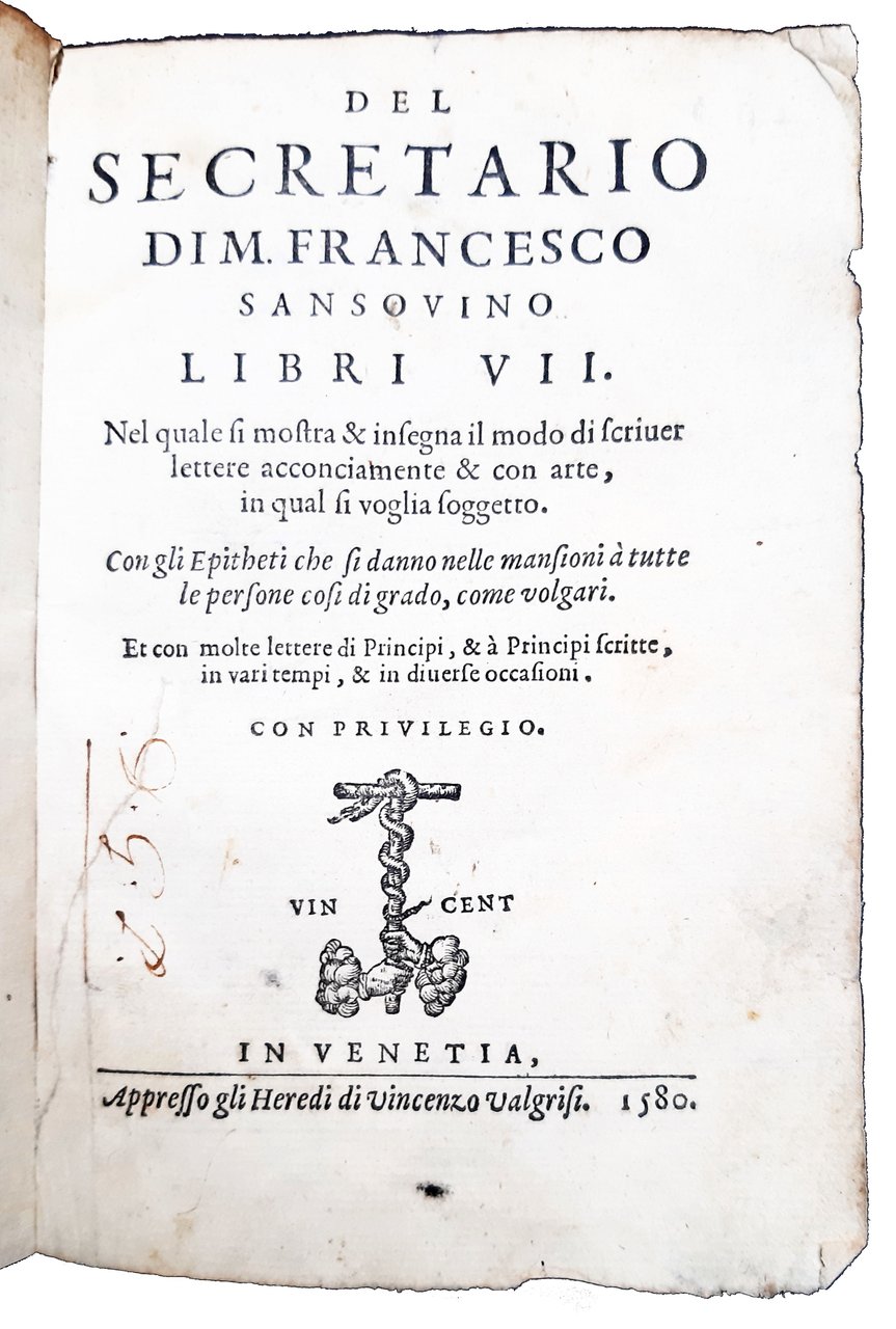 Del secretario di m. Francesco Sansouino libri VII. Nel quale si mostra & insegna il modo di scriuer lettere acconciamente & con arte, in qual si voglia soggetto. Con gli epitheti che si danno nelle mansioni à tutte le persone cosi di grado, come volgari. Et con molte lettere di principi, & à principi scritte, in vari tempi, & in diuerse occasioni.