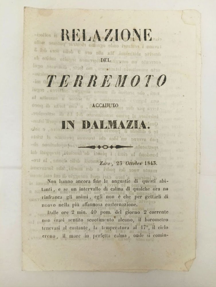 >In-8 (mm 180 x 120), pp. 4. La relazione descrive dettagliatamente il terremoto avvenuto in Dalmazia il 2 e 3 ottobre 1843: "Non hanno ancora fine le angustie di questi abitanti, e se un intervallo di calma di qualche ora ne rinfranca gli animi, egli non è che per gettarli di nuovo nella più affannosa costernazione". La descrizione è corredata di orari precisi che ne scandiscono l'evoluzione ("...risulta che alle ore 7 minuti 35 pomeridiane del giorno 4 sentissi una detonazione...", "...che finalmente oggi all'ora 1 e 1/2 antimeridiane fu avvertita una leggiera scossa, ed un'altra breve , ma più forte alle ore 5 minuti 50 di quetsa mattina."). Interessante esemplare in buono stato di conservazione.