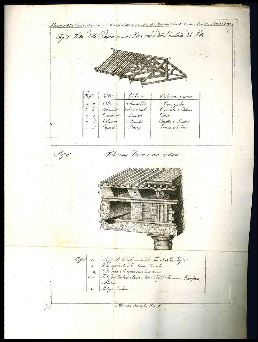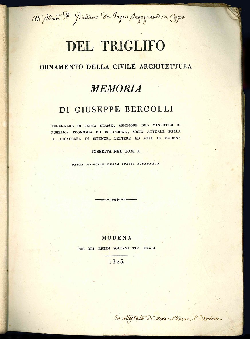 In 4to (mm 276x208);pp. 26, [3] c. di tav. calcografiche più volte ripiegate. Carta colorata originale. Minime mancanze alla copertina anteriore e agli angoli. Tagli spruzzati in rosso. Dedica manoscritta dell'Autore a Giuliano de Fazio al frontespizio ("All'Illmo. D. Giuliano de Fazio, Ingegnere in Capo...In attestato di vera stima, L'Autore"). Estratto dalle Memorie della R. Accademia di Modena (Tomo I).