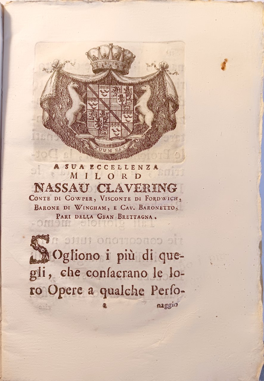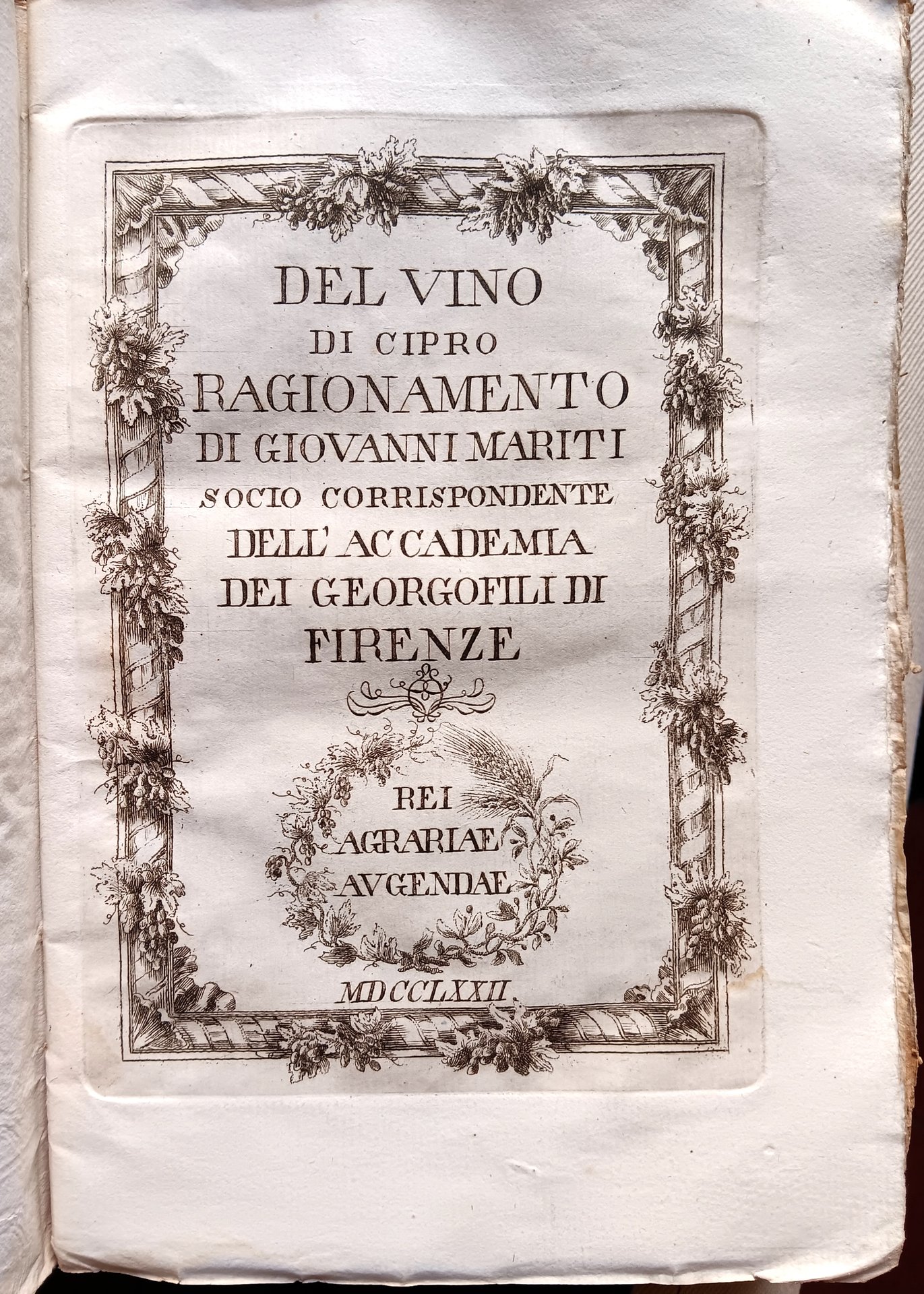 In-8°, (2), XVI, 127pp (1c), frontespizio calcografico, a carta a1r vignetta calcografica alle armi del dedicatario Lord Nassau Clavering, legni nel testo. Legatura in carta colorata coeva.Titolo manoscritto su tassello di carta al dorso. Esemplare perfetto con barbe. Giovanni Mariti dedicò quest’opera a Lord Clavering, le carte iniziali includono inoltre una descrizione dell’Accademia dei Georgofili fondata nel 1753 e attiva tutt’oggi. Mariti visse sette anni a Cipro e qui diventò viceconsole britannico onorario. La sua conoscenza con la produzione del vino locale lo portò poi alla realizzazione di quest’opera, corredata di alcune illustrazioni xilografiche relative agli attrezzi per la viticoltura e per la conservazione del vino. Mariti inoltre discute ampiamente sui tipi e varietà dei vitigni dell’isola, concludendo che possa essere possibile adottare la stessa tecnica pure in Italia.Lastri p.82; Sormanni p.79; Bibl. Vinaria p. 139; Bibl. Gastronomica 1002.
