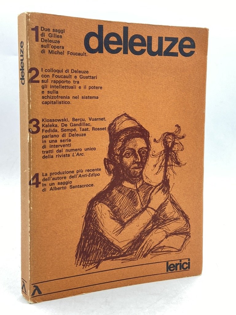 Brossura editoriale illustrata, cm 21 x 14, pp 190 (2). Numero unico dedicato al filosofo francese, con due saggi di Deleuze sul pensiero di Michel Foucault (Un nuovo archivista; Non uno scrittore: un nuovo cartografo), colloqui di Deleuze con Foucault (Gli intellettuali e il potere) e Guattari (Su Capitalismo e Schizofrenia), scritti di Pierre Klossowski (Digressione a partire da un ritratto apocrifo), France Berçu (Sed perseverare diabolicum), Jean-Noel Vuarnet (Metamorfosi di Sofia), Ferard Kaleka (Un Hegel filosoficamente barbuto), Maurice De Gandillac (Verso una schizo-analisi?), Pierre Fedida (Il filsofo e la sua pelle), Jean Claude Sempé (L’esca e il simulacro), A. Mieke Taat (I segni del fuoco), Clement Rosset (Secchezza di Deleuze), Alberto Santacroce (Kafka e il giuoco della Legge). I testi sono tratti dai Periodici Critique e L’Arc e sono tradotti da Giorgio Patrizi.