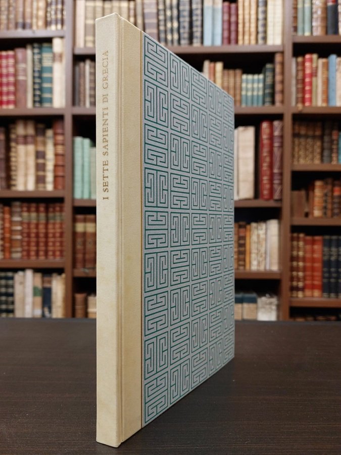 <span style="font-style: normal;">In-8° (cm. 24,8), legatura editoriale in mezza pergamena con titolo in oro al dorso e piatti in carta decorata Ingres grigia (protetta da acetato), taglio superiore dorato; pp. [4b] 87 [5] in perfetto stato; 1 foglio sciolto editoriale </span><i>Al lettore</i>. Prima edizione italiana del testo tramandato dallo storico Giovanni Stobeo, tradotto da Enzio Cetrangolo e proposto con cura da Giovanni Mardersteig. I vari motti delfici, stampati su sfondo terracotta, precedono le sentenze di ciascun sapiente e il loro carattere è copiato dalla più bella tavola epigrafica greca dell'anno 408-7 del Museo Epigrafico di Atene; il testo invece è composto in una nuova incisione dell'alfabeto di Francesco Griffo. Cfr. Schmoller 195. Esemplare impeccabile conservato nella sua custodia telata. (SP4)
