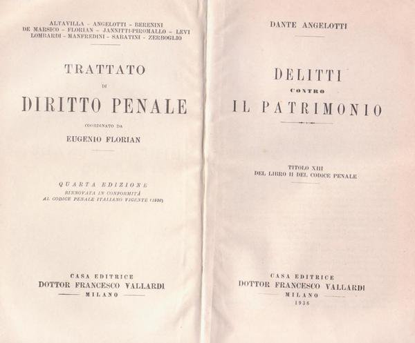 Quarta Edizione rinnovata in conformità al codice penale italiano vigente (1930), Milano, 1936. Titolo XIII del libro II del codice penale. Libro facente parte della collana: Trattato di Diritto Penale a cura di Eugenio Florian. Testo in ottime condizioni rilegato con copertina rigida a tutta tela blu in buone o discrete condizioni. Titoli in oro al piatto e al dorso. Qualche traccia d'uso, qualche angolo smussato. Spedizioni tracciabili con raccomandata entro 24 ore dall'ordine. Hardback cover in good conditions, no inscriptions or markings inside. Worldwide delivery.
