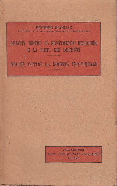 In-8 (Cm 22 x 14), pp. XXIV-482, brossura editoriale con alette. Collana Trattato di diritto penale coordinato da Eugenio Florian. Quarta edizione in conformità al codice intaliano vigente (1930). Titolo IV e Titolo XII del libro II del codice penale. Intonso. macchiolina alla brossura posteriore. Millimetrica macchiolina e abrasione al margine esterno di alcune pagine, piccola macchiolina all'ultima p. BUONO