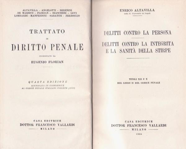 Quarta Edizione rinnovata in conformità al codice penale italiano vigente (1930), Milano, 1934. Titolo XII e X del libro II del codice penale. Libro facente parte della collana: Trattato di Diritto Penale a cura di Eugenio Florian. Testo in ottime condizioni rilegato con copertina rigida a tutta tela blu in buone o discrete condizioni. Titoli in oro al piatto e al dorso. Qualche traccia d'uso, qualche angolo smussato. Spedizioni tracciabili con raccomandata entro 24 ore dall'ordine. Hardback cover in good conditions, no inscriptions or markings inside. Worldwide delivery.
