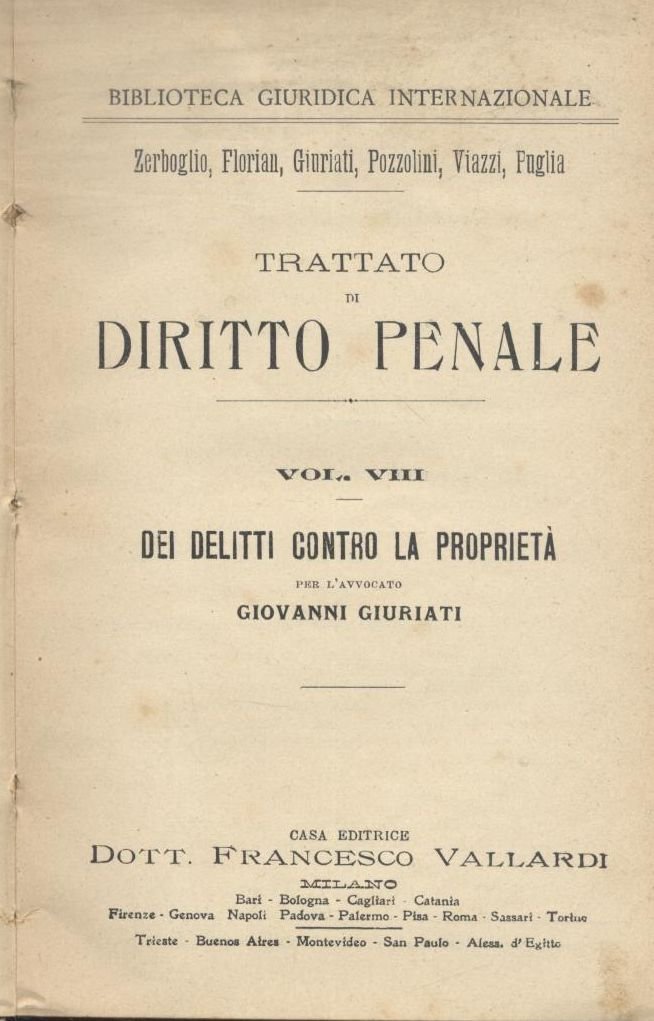 Volume VIII dell'opera "trattato di diritto penale" Vallardi editore, senza data (1904?) XI + 420 Pagine.