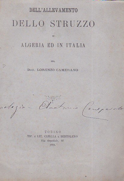 In-8°, pp. 21, brossura editoriale a stampa. Alcune tabelle n.t. Ottimo stato. Estratto dagli 'Annali della R. Accademia d'Agricoltura di Torino', vol. XXIV, adunanza del 5 luglio 1881. 'I naturalisti e gli allevatori si sono fatta varie volte la domanda se convenga meglio introdurre nel nostro paese nuove specie di animali cercando di addomesticarle, o se sia invece miglior partito cercare di migliorare le specie già esistenti allo stato domestico'. Il Camerano (Biella, 1856-Torino, 1917), illustre zoologo e naturalista, fu professore di anatomia comparata all'Università di Cagliari (1889-1894) e in quella di Torino (1894-1917), nonché direttore del Museo Zoologico della stessa città (1894-1917), che contribuì ad arricchire con eccezionali collezioni. Allievo in gioventù del corso di pittura di Fontanesi, fu qui ingaggiato dal Lessona per alcuni disegni di animali che gli occorrevano. Egli sviluppò così il suo interesse per le scienze naturali che lo portarono a laurearsi in tale materia nel 1878 e a ricoprire, nello stesso anno, la carica di assistente presso il Museo Zoologico torinese, da lui poi a lungo diretto. Presidente dell'Accademia delle Scienze di Torino e poi del C.A.I., fu inoltre rettore dell'Università di Torino e Senatore dal 1909. La sua estesissima bibliografia spaziò lungo ogni possibile ramo della zoologia, adottando un convinto approccio evoluzionista. Cfr. Conci, Repertorio delle biografie e bibliografie degli scrittori e cultori italiani di entomologia, pp. 866-867.