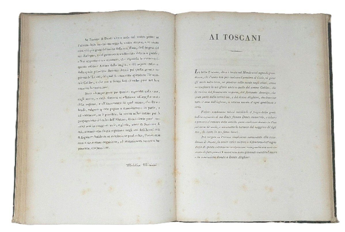 >in-4 grande, 2 parti in un volume, pp. (8), 35; (VI), 40. Legatura coeva in mezza pelle verde, titolo e filetti in oro al dorso. La prima opera è adorna di 2 grandi ritratti incisi a mezzo busto, di Beatrice e di Dante. Bell'invio autografo a Giuseppe Spada ''posseditore di lingue dotte'', da parte di Pietro Manni, cui il Missirini dedicò le ''memorie di Dante''. Bell'esemplare, ad ampissimi margini.