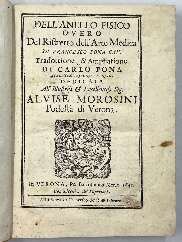 DELL’ANELLO FISICO OVERO Del Ristretto dell’Arte Medica DI FRANCESCO PONA CAV. Tradottione, & Ampliatione di CARLO PONA Accademico Incognito Veneto. IN VERONA, Per Bartolomeo Merlo, ad istanza di Francesco de' Rossi libraro 1641.