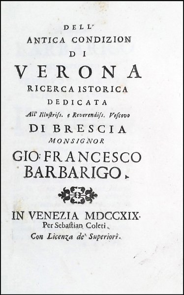 Dell'antica condizion di Verona ricerca istorica dedicata all'illustriss. e reverendiss. vescovo di Brescia monsignor Gio. Francesco Barbarigo.