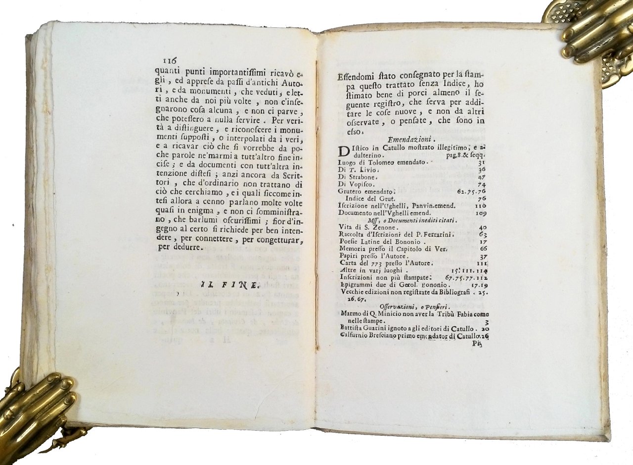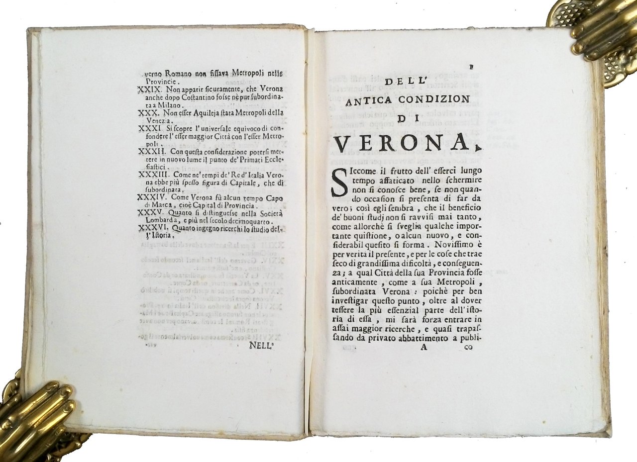 in-8° (180x124 mm); leg. in cartonato rustico coevo, con titolo manoscritto al dorso; pp. [12], 116, [4]. Poco diffusa opera letteraria a cura di Scipione Maffei, in cuio viene confutata l’opinione che Verona fosse storicamente sottoposta a Brescia. Scipione Maffei (noto anche con altri nomi: Pindemonte, Desiderato, Brenteatico, Orillo)(1675-1755), veronese, erudito, letterato, entra in Arcadia come poeta. Rif.: IT\ICCU\VIAE\007786. Lozzi 6298. Cond.: in condizioni generali molto buone. -- UNCOMMON HISTORICAL AND LITERARY WORK BY SCIPIONE MAFFEI, IN WHICH THE OPINION THAT VERONA WAS HISTORICALLY SUBJECT TO BRESCIA IS REBUTTED. Copy in very good condition.