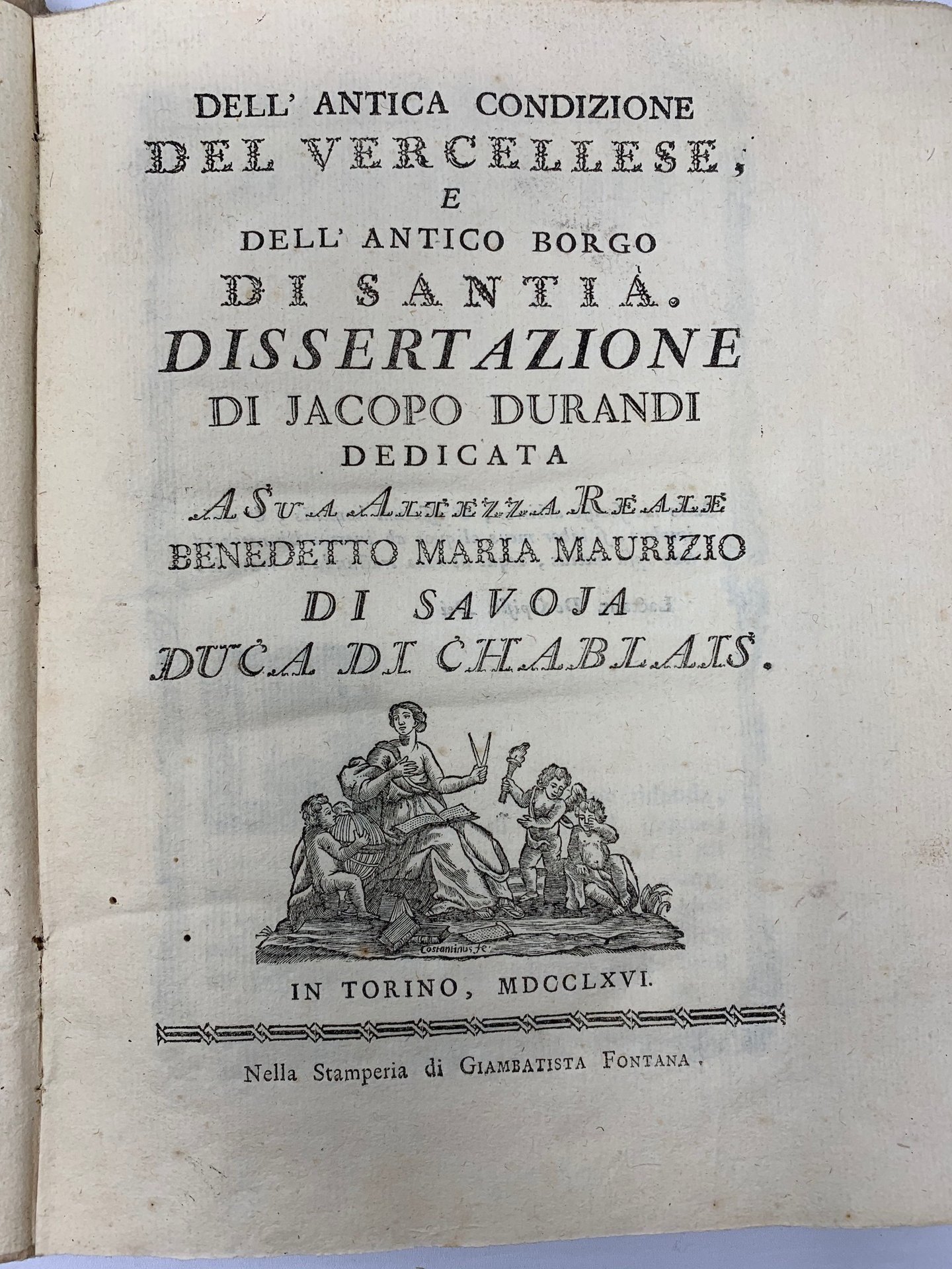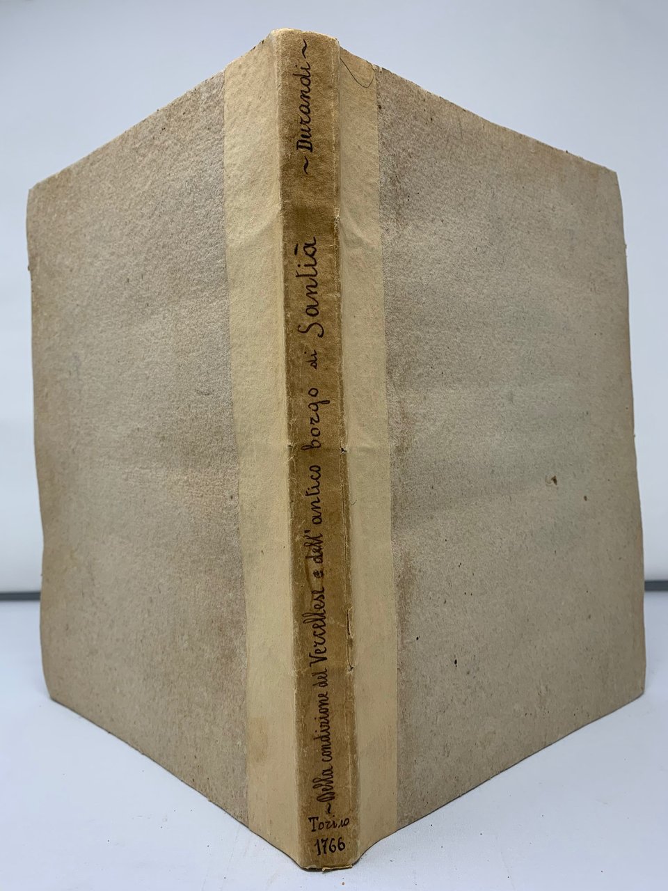 >in-4, pp. VIII, 152, legatura originale in cartone rustico, titolo manoscritto lungo al dorso. Prima edizione, rara. Il Durandi fu personaggio di vasta erudizione, collega ed amico del Vernazza e del Denina ed una delle figure di spicco della cultura storica piemontese del secondo settecento. La presente fu la sua prima opera data alle stampe e rappresenta una pietra miliare della storiografia piemontese. Esempl. genuino (piccoli fori di tarlo nel margine interno bianco). R.Ordano, I.Durandi, pp.73-76 e 103. Manno III, 12900.