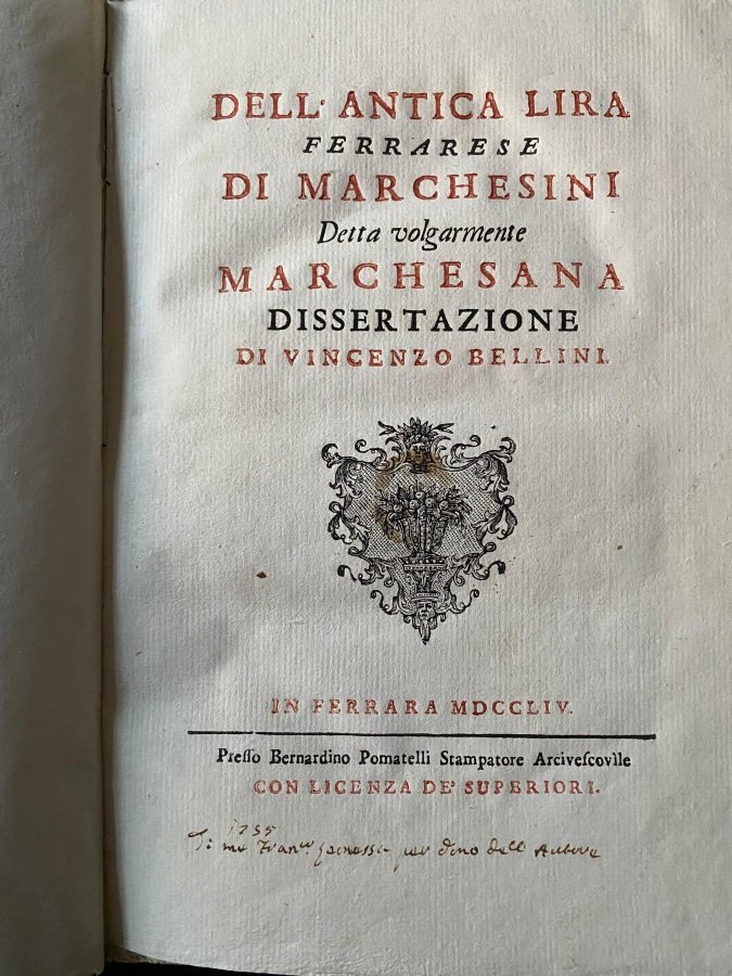 <span style="font-style: normal;">In 4° (cm. 27,7), legatura di poco successiva in mezza pergamena con titolo su tassello al dorso; pp. IX (3b) 208 in ottimo stato e fresche, ricche di illustrazioni numismatiche, con frontespizio in rosso e nero; antica firma di appartenenza con </span><i>Ex dono</i><span style="font-style: normal;"> dell'autore al margine del frontespizio e antiche iniziali al suo </span><i>verso</i>. Prima e unica edizione di questa storia della moneta ideale locale, opera «fondata su ampie ricerche d'archivio ed assai favorevolmente recensita» [D.B.I., VII, pp. 716-718]. «È questa una dissertazione eruditissima nella quale si correggono il conte Carli circa il giusto valore della Lira de Marchesini ed il Muratori» [Ranghiasci F/18]. Cfr. Lozzi 1620; Einaudi 390. Ottimo esemplare. (SH3)