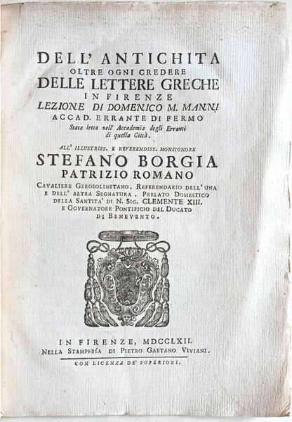 Dell'antichità oltre ogni credere delle lettere greche in Firenze. Lezione di Domenico M. Manni Accad. errante di Fermo [.].