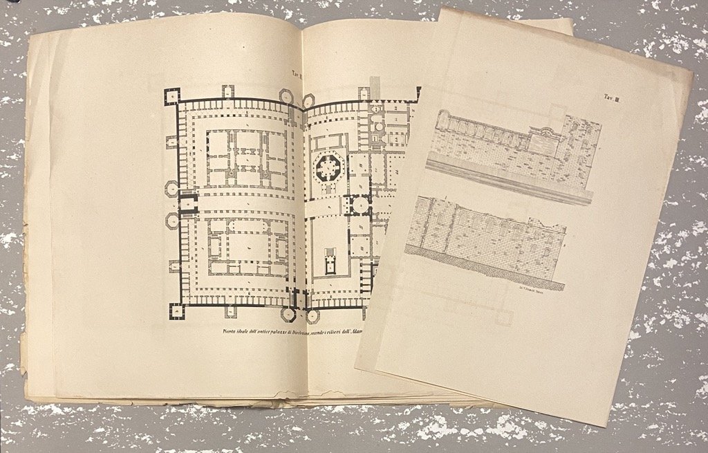 Brossura editoriale a stampa, in quarto cm 35 x 25, pp 28 (4) con XII tavole fuori testo in parte ripiegate, il tutto a fascicoli sciolti entro l’originale copertina editoriale, quest’ultima con minimi restauri. Agile studio archeologico di Giovanni Lanza sul palazzo in cui Diocleziano si ritirò nel 305 d.C. a Spalato; l’autore, membro di svariate accademie e società scientifiche, era direttore del Museo Nazionale di Zara. L’opera, dedicata al mercante, agronomo e funzionario consolare austriaco Ludwig von Guttmannstahl, è illustrata con numerose tavole con piante, bassorilievi e vari dettagli dell’edificio, inclusa una veduta del palazzo nella contemporanea piazza del Duomo. Lo studio ottenne favorevoli recensioni all’epoca, sia in Italia («è tutto quel di meglio che in argomento si possa leggere», Zarbarini 1890) sia all’estero («useful study … in which he has made sundry correction of Adam», Burton 1876). Non comune. Lozzi, II, 5216; Platneriana, p. 373.