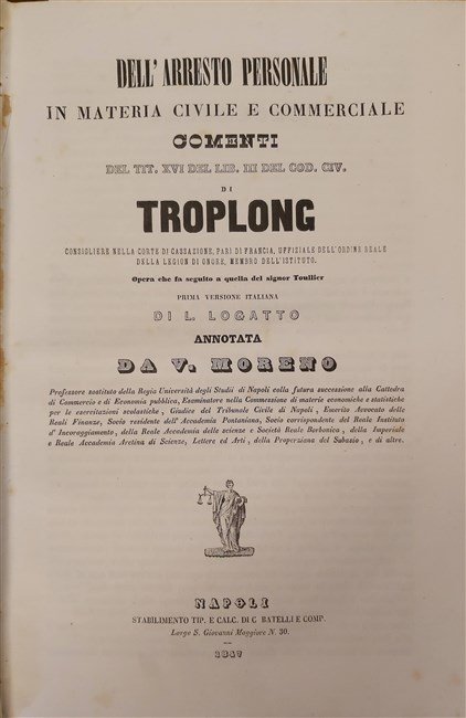 DELL'ARRESTO PERSONALE in materia civile e commerciale. Comenti del tit. XVI del Lib. III del Cod. Civ. di. Consigliere nella Corte di cassazione. Prima versione italiana di L. Logatto annotata da V. Moreno.