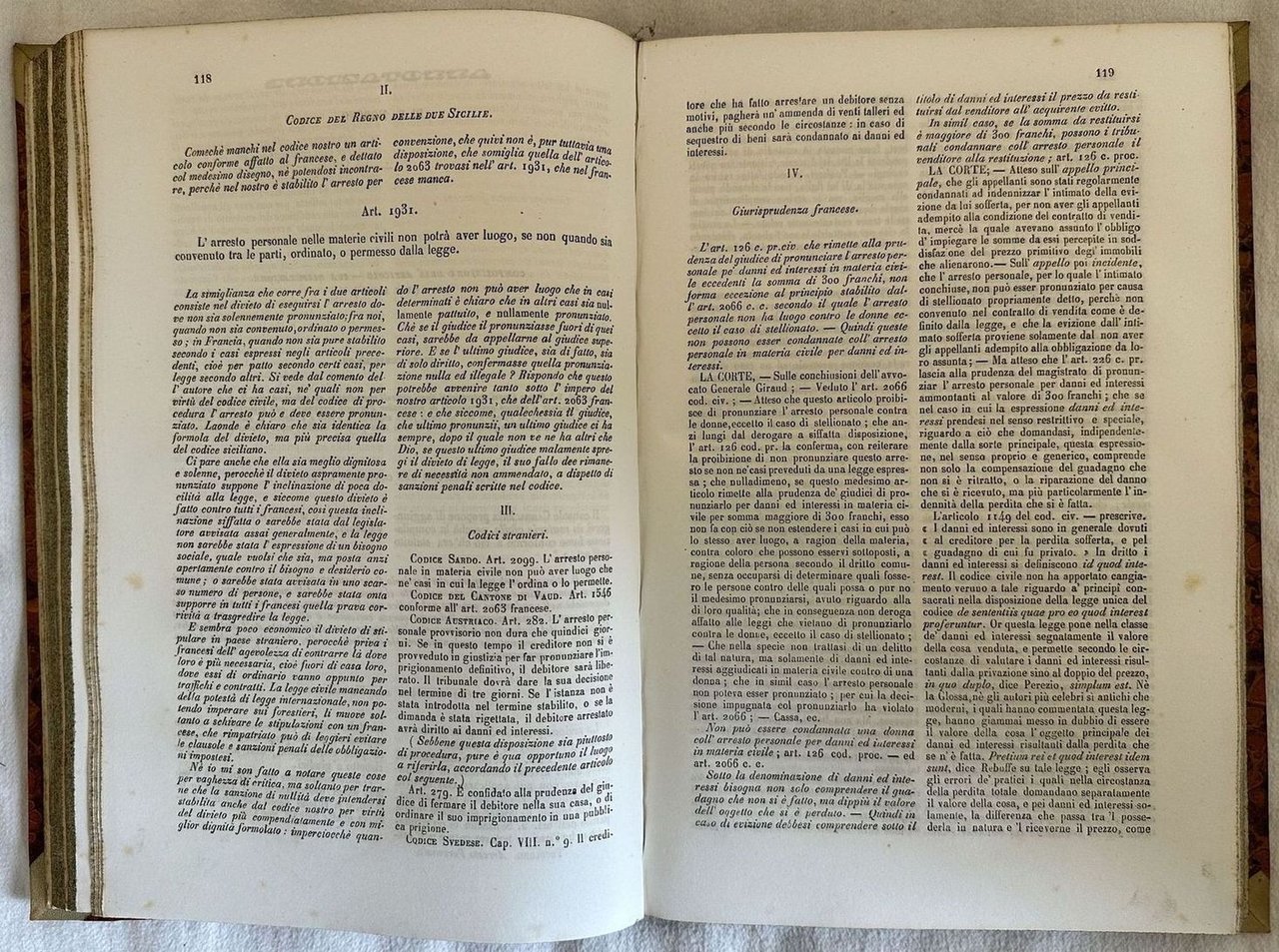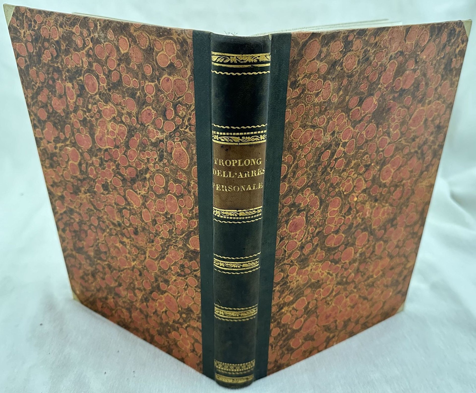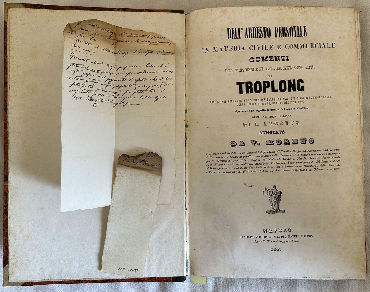 Edizione del 1847 di questa monografia sull'arresto personale in maniera civile e commerciale scritto da Troplong. All'interno: cenno storico, esposizione de motivi, dell'arresto in materia civile (disposizioni in materia civile, ordinaria, denari ed effetti mobiliari pubblici, contro gli stranieri, materia criminale correzionale e di polizia, transitorie ecc.). Traduzione a cura di L. Logatto con note di V. Moreno Insieme al volume due fogli con alcune note manoscritte. In ottime condizioni e completo. Copertina in mezza pelle con titolo e decorazioni in oro al dorso in ottime condizioni generali con lievi usure ai margini e dorso. Legatura in buone condizioni. All'interno le pagine si presentano in buone condizioni con fioriture. In 4. Dim. 29,5x20 cm. Pp. CXXXI+(1)+352.Edition of 1847 of this monography about personal detention in civil and trade matter written by Troplong. Inside: history, exposition of reasons, arrest in civil matter (disposition in civil matter, public effects, against strangers, criminal correctional matter and of police, etc.) In very good conditions and complete. Half leather coeval cover with gilted title and decorations in very good general conditions lightly worn in the extremities. Binding in good conditions. Inside pages are in good conditions with occasional foxing. In 4. Dim. 29,5x20 cm. Pp. CXXXI+(1)+352.