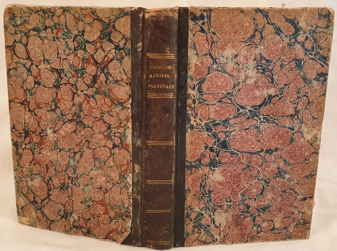 Edizione del 1850 di questa manografia sull'arresto personale in maniera civile e commerciale scritto da Troplong. All'interno: cenno storico, esposizione de motivi, dell'arresto in materia civile (disposizioni in materia civile, ordinaria, denari ed effetti mobiliari pubblici, contro gli stranieri, materia criminale correzionale e di polizia, transitorie ecc.) In ottime condizioni e completo. Copertina in mezza pelle con titolo e decorazioni in oro al dorso in buone condizioni generali con lievi usure ai margini e dorso. Legatura in buone condizioni. All'interno le pagine si presentano in buone condizioni con fioriture. In 8. Dim. 21,5x14 cm. Pp. 425. Edition of 1850 of this monography about personal detention in civil and trade matter written by Troplong. Inside: history, exposition of reasons, arrest in civil matter (disposition in civil matter, public effects, against strangers, criminal correctional matter and of police, etc.) In very good conditions and complete. Half leather coeval cover with golden title and decorations in good general conditions slightly worn in the edges and spine. Binding in good conditions. Inside pages are in good conditions with occasional foxings. In 8. Dim. 21,5x14 cm. Pp. 425.