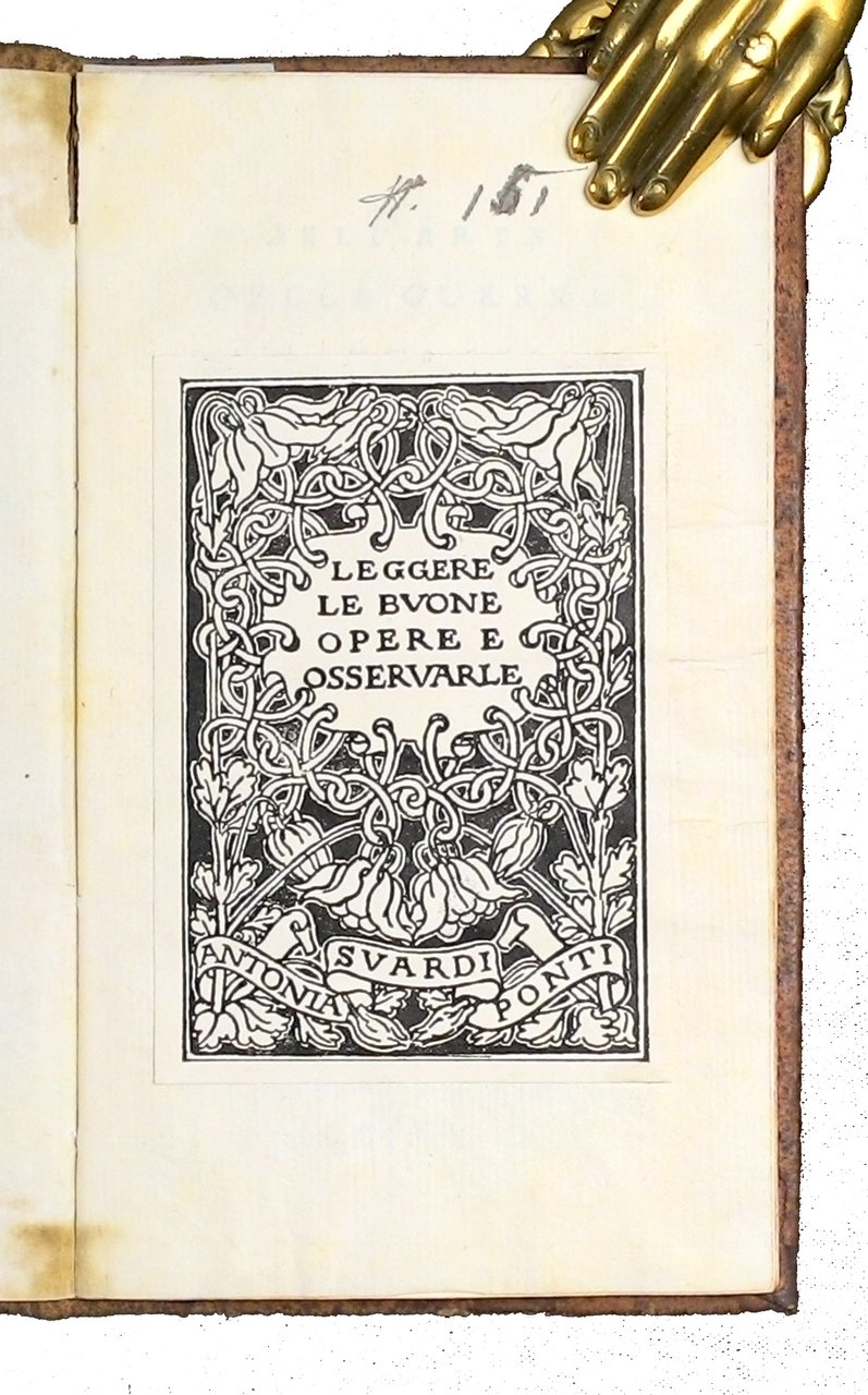 12mo (174x100 mm); leg. in piena pelle marrone screziata con filetti impressi a freddo ai piatti ed al dorso, traccia di etichetta di biblioteca al dorso, guardie marmorizzate, tagli a spruzzo rossi; pp. 62; frontespizio con titolo in b/n e vignetta. Rara traduzione in italiano de l'"Art de la guerre" scritta da Federico II Re di Prussia direttamente in francese. Federico II di Hohenzollern, detto Federico il Grande, (1712-1786), fu re di Prussia dal 1740 alla sua morte. Fu uno dei personaggi più importanti e rappresentativi del suo tempo, incarnando l'archetipo settecentesco del monarca illuminato. La sua complessa azione di governo del suo stato si svolse sul piano politico e militare, su quello dell'economia e dell'amministrazione statale ed anche nel campo dello sviluppo delle scienze e delle arti. Compose anche alcune sinfonie ed alcuni concerti per flauto - di cui era abilissimo suonatore - e orchestra da camera. Risiedette nel suo castello di Sans-Souci, il cui nome significa "senza pensieri", costruito su suo stesso disegno. Prov.: Indicazione d'appartenenza a nome di Antonia Svardi Ponti su grande etichetta ex-libris incollata alla seconda guardia libera anteriore con motto "Leggere le buone opere ed osservarle". Rif.: IT\ICCU\UBOE\117842 (4 copie). Edizione non censita da OCLC, che invece registra l'ed. successiva del 1765. Cond.: Carte pulite e croccanti, testo marginoso; opera in condizioni generali molto buone. -- ITALIAN TRANSLATION OF THE "ART DE LA GUERRE" WRITTEN IN FRENCH BY KING FREDERICK II OF PRUSSIA. Clean and crispy leaves, tall copy, in very good condition. -- Pleine basane brune ancienne, plats et dos ornes de filets et motifs a froid. Bel exemplaire de cette rare traduction italienne de l'"Art de la guerre" de Frederic II qui avait ecrit directement en francais.