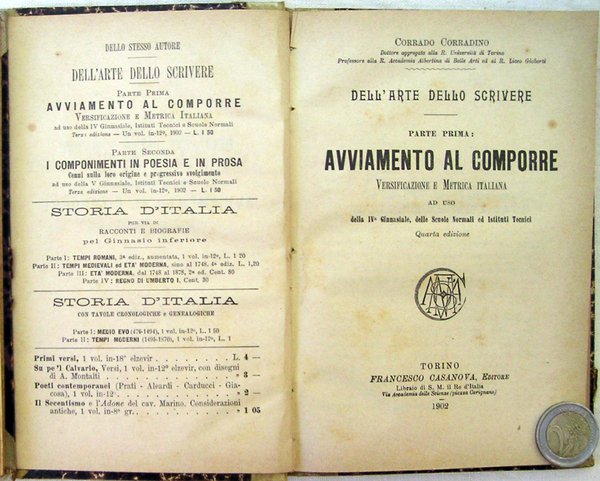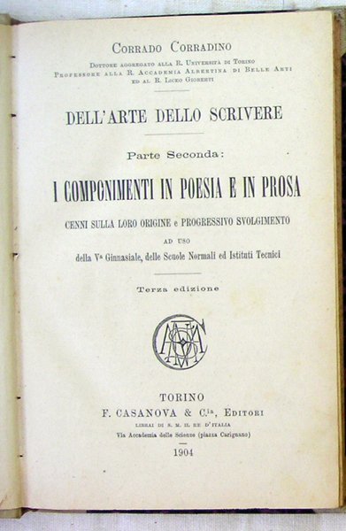 [1.]: Parte prima: avviamento al comporre. Versificazione e metrica italiana ad uso della IV Ginnasiale, delle Scuole Normali ed Istituti Tecnici. Quarta edizione. Torino: Francesco Casanova, Editore, 1902. [2.]: Parte seconda: i componimenti in poesia e prosa. Cenni sulla loro origine e progressivo svolgimento ad uso della V Ginnasiale, delle Scuole Normali ed Istituti Tecnici. Terza edizione. Torino: Francesco Casanova, Editore, 1904. in-16° ( cm 18 x 12); opera in due volumi: [1.]: pp. VII, 135; leg. in mezza pergamena con angoli e carta marmorizzata ai piatti, tracce sbiadite di titolo manoscritto al dorso; quarta edizione; [2.]: pp. 147; leg. in mezza pergamena con angoli e carta marmorizzata ai piatti, nome dell'Autore (Corrado) manoscritto al dorso; terza edizione. Trattasi di una sintesi per l'avvio a comporre in buon italiano, scritto dal Dott. Corradino Corrado (1853-1923), severo insegnante di letteratura e storia dell'arte, critico letterario e d'arte, poeta, docente dell'Università di Torino, della Regia Accademia Albertina di Belle Arti e del Liceo Gioberti, nato e morto a Torino. Rif.: [1.]: IT\ICCU\CUB\0214134. [2.]: IT\ICCU\CUB\0214136. Cond.: [1.]: presenza di residui di carta incollata su parte della pergamena di legatura (scollabili); lievi tracce d'uso. [2.]: lievi tracce d'uso; indicazione d'appartenenza con timbro ad inchiostro nero al bordo sup. della guardia libera anteriore. Esemplari in buone condizioni generali.