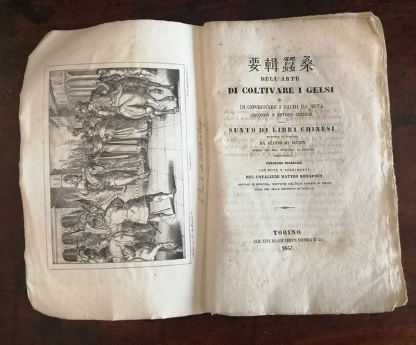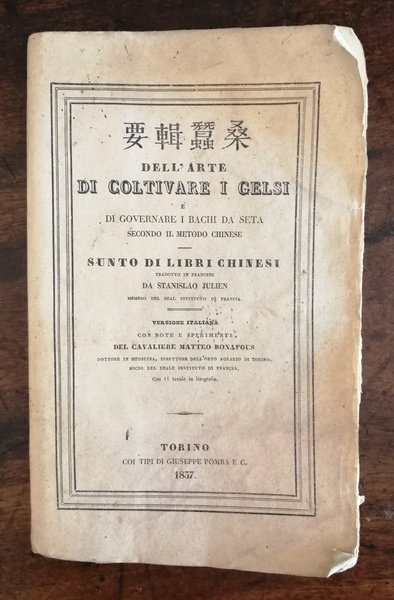 Sunto di libri chinesi tradotto in francese da Stanislao Julien. Versione italiana con note e sperimenti del Cavaliere Matteo Bonafous. Torino, Coi Tipi di Giuseppe Pomba, 1837. In -8, pp.VIII-208 con 1 tavola in antiporta e 10 tavole litografiche fuori testo. Brossura editoriale. Prima edizione italiana. Leggere fioriture a qualche pagina, lievi tracce d'uso alla copertina, per il resto esemplare più che buono.