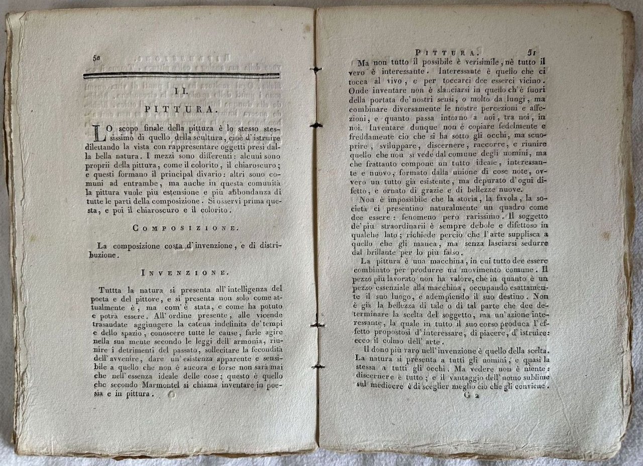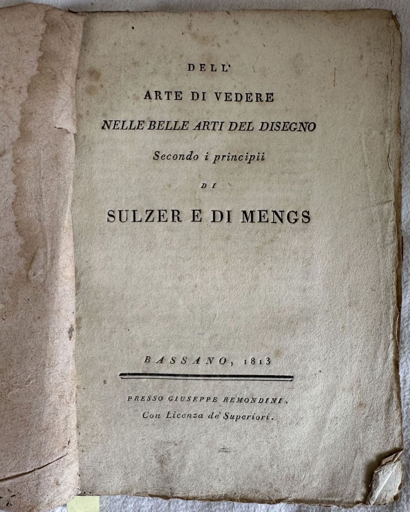 Edizione Remondini del 1813 di questo interessante opuscolo di Francesco Milizia. L'autore introduce un nuovo criterio per giudicare le opere d'arte basandosi sui principi di Sulzer e Mengs. "Terribile opuscolo che rovesciò il sistema di scrivere e di pensare in materia d'arti, e che secondo alcuni è pieno d'eresie. Ma siamo debitori a questo scrittore pieno di dottrina e d'ingegno d'aver tolto il velo ad una folla di pregiudizi, e di vedere introdotta una libera maniera di giudicare in materia d'arti." Cfr. Cicognara. "L'arte barocca, scrive lo Schlosser, non ebbe avversario più convinto di lui." Cfr. Schlosser (667). In buone condizioni. Copertina morbida coeva in discrete condizioni generali con usure e mancanze. Legatura in buone condizioni. All'interno le pagine si presentano in buone condizioni con rare fioriture. In 16. Dim. 19,5x13,5 cm. Pp. 88.<BR>Remondini edition of 1813 of this interesting pamhplet by Francesco Milizia. The author introduces a new criteria for judging works of art based on the aesthetic vie of Sulzer and Mengs. "Terribile opuscolo che rovesciò il sistema di scrivere e di pensare in materia d'arti, e che secondo alcuni è pieno d'eresie. Ma siamo debitori a questo scrittore pieno di dottrina e d'ingegno d'aver tolto il velo ad una folla di pregiudizi, e di vedere introdotta una libera maniera di giudicare in materia d'arti." Cfr. Cicognara. "L'arte barocca, scrive lo Schlosser, non ebbe avversario più convinto di lui." Cfr. Schlosser (667). In good conditions. Soft coeval cover in fair general conditions with wearings and lackings. Binding in good conditions. Pages in good conditions with occasional foxing. In 16. Dim. 19,5x13,5 cm. Pp. 88.