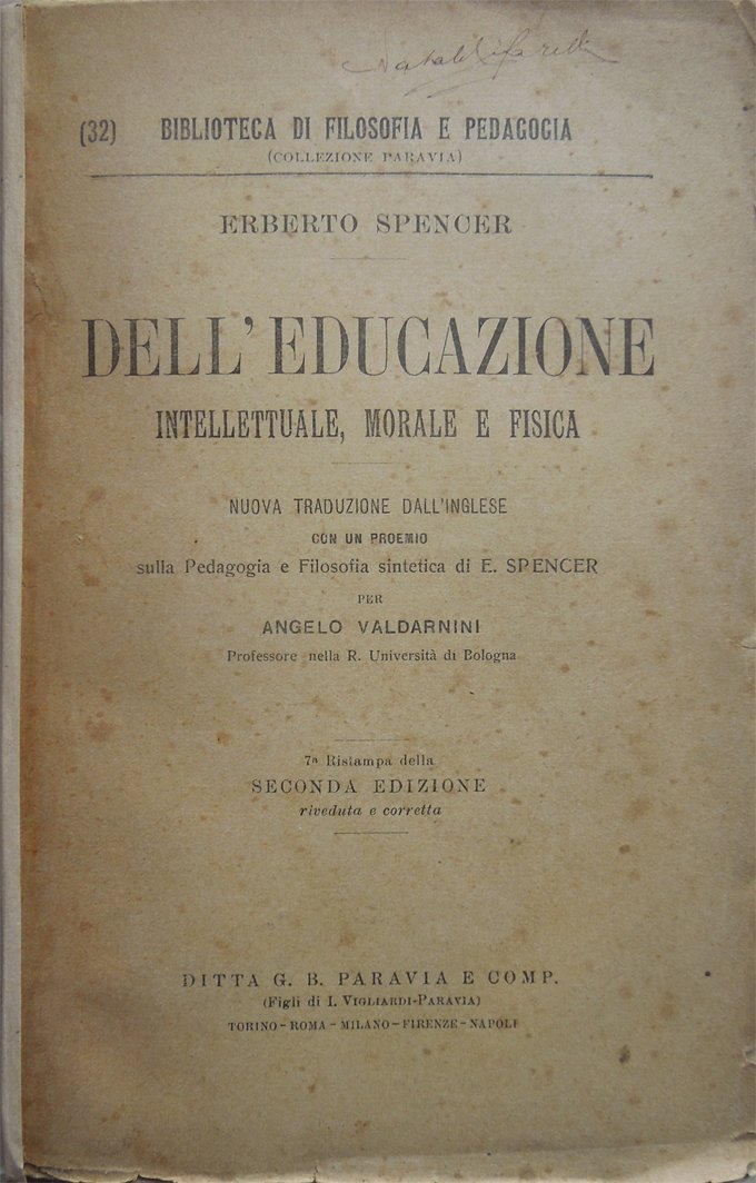 Dell'educazione intellettuale morale e fisica. Nuova traduzione dall'inglese con proemio sulla Pedagogia e Filosofia sintetica di E. Spencer per Angelo Valdarnini. 7.a Ristampa della seconda edizione riveduta e corretta