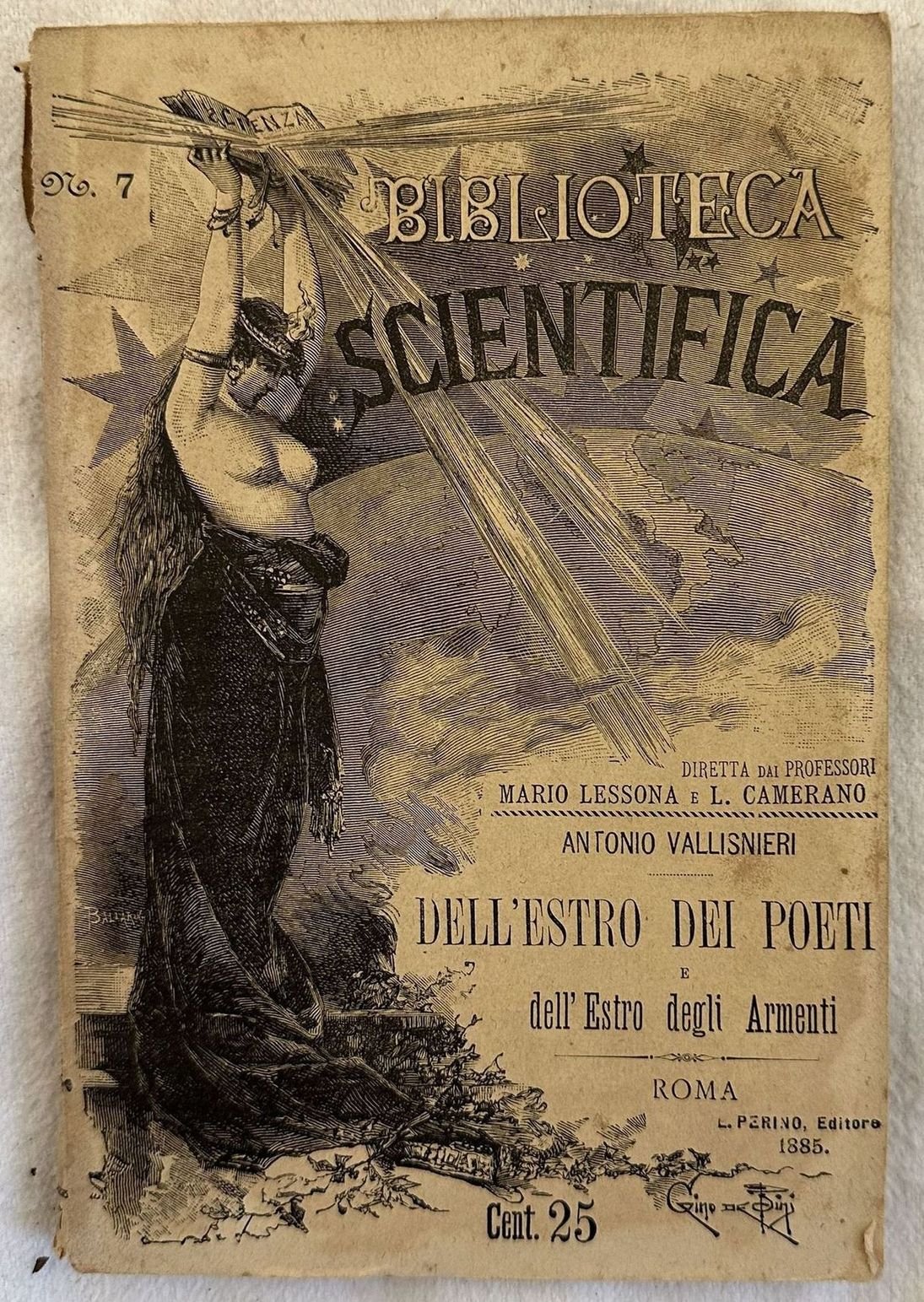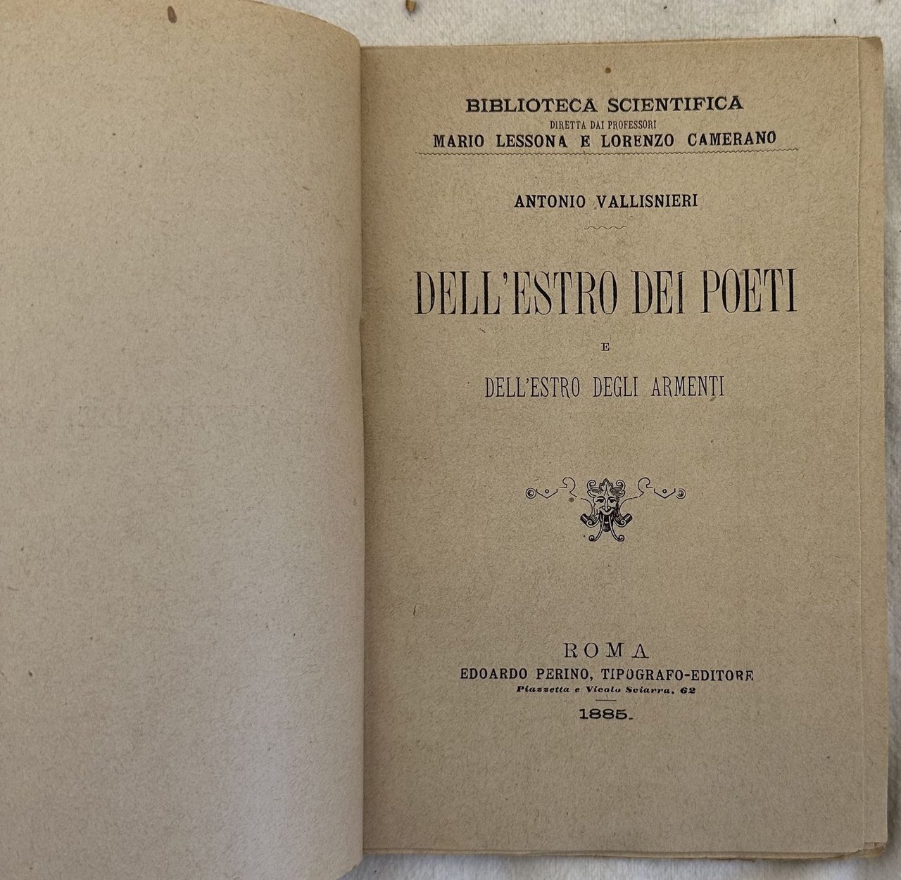 Edizione del 1885 di questo studio sull'estro dei poeti scritto dal naturalista italiano Antonio Vallisnieri (Trassilico Grafagnana 1661-Padova 1730). "V. portò contributi fondamentali in elmintologia e entomologia, dimostrò l'inconsistenza della generazione spontanea, completando così l'opera di F. Redi" Courtesy Treccani online. Nella seconda parte "I terremoti" di Ferruccio Rizzatti (Carpi 1862- Torino 1939). Opera della collana "Biblioteca scientifica di Mario Lessona e Lorenzo Camerano". In buone condizioni. Copertina editoriale in buone condizioni con lievi usure ai margini e dorso. Legatura in buone condizioni. Pagine in ottime condizioni con rare fioriture. In 16. 17x11,5 cm. Pp. 96.Edition of 1885 of this study about the carachter of the poets written by the italian naturalist Antonio Vallisnieri (Trassilico Grafagnana 1661-Padova 1730). "V. portò contributi fondamentali in elmintologia e entomologia, dimostrò l'inconsistenza della generazione spontanea, completando così l'opera di F. Redi" Courtesy Treccani online. in the second part "I terremoti" by Ferruccio Rizzatti (Carpi 1862- Torino 1939). Work of the series "Biblioteca scientifica di Mario Lessona e Lorenzo Camerano". In good conditions. Editorial cover in good conditions lightly worn in the edges. Binding in good conditions. Inside pages are in very good conditions with occasional foxing In 16. 17x11,5 cm. Pp. 96.