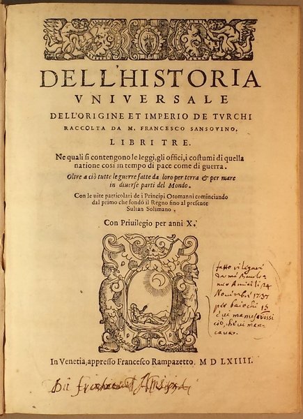 Dell'historia universale dell'origine et imperio de Turchi raccolta da m. Francesco Sansovino. Libri tre. Ne quali si contengono le leggi, gli offici, i costumi di quella natione così in tempo di pace come di guerra. Oltre a ciò tutte le guerre fatte da loro per terra & per mare in diverse parti del Mondo. Con le vite particolari de i principi Otomanni cominciando dal primo che fondò il Regno sino al presente sultan Solimano. Con Privilegio per anni X.